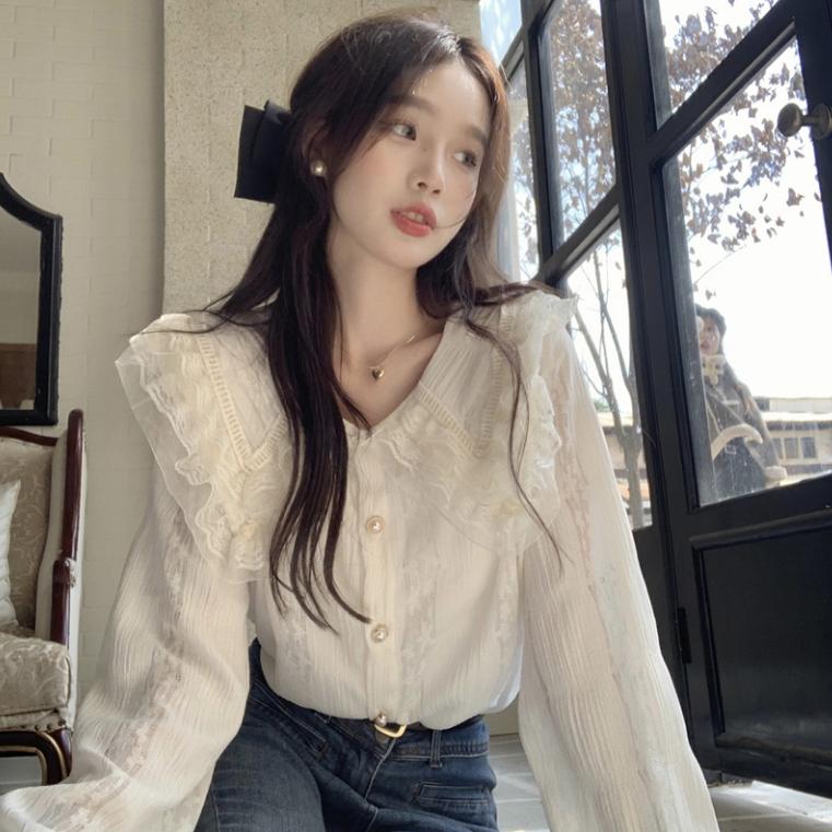 春天氣息!約會必搭💝 韓版溫柔lady珍珠釦蕾絲襯衫 韓系 顯瘦 女裝 衣服 基本款 T恤 短袖 上衣 短版 上著