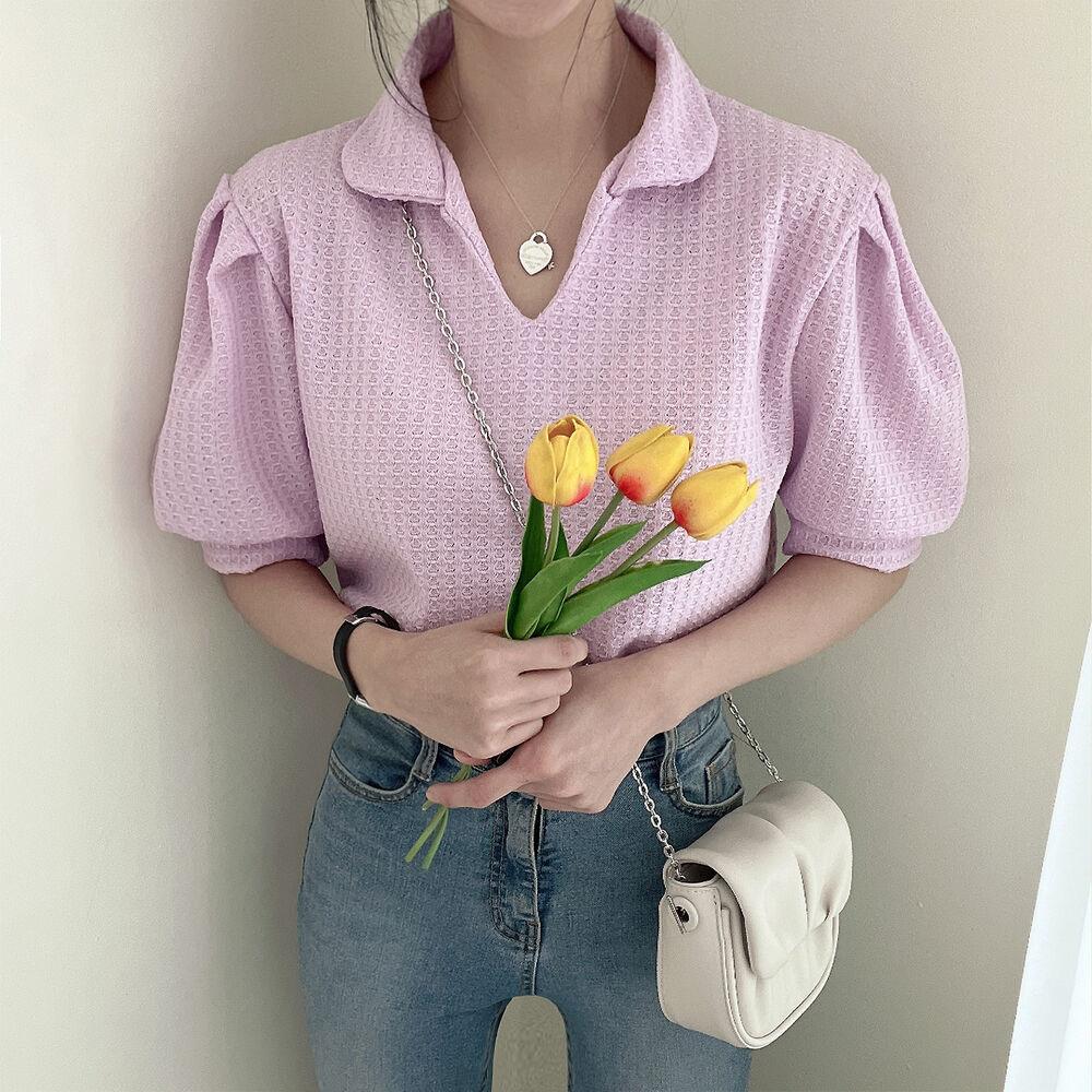 春款配色超美🌷 韓版溫柔小V領華夫格上衣(3色)韓系 顯瘦 特價 女裝 衣服 基本款 T恤 短袖 上衣 短版 上著