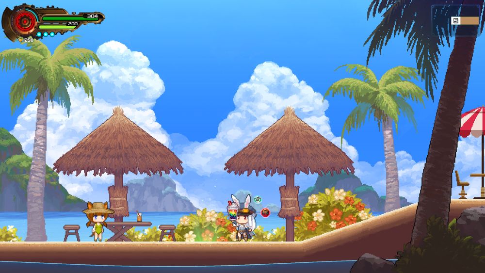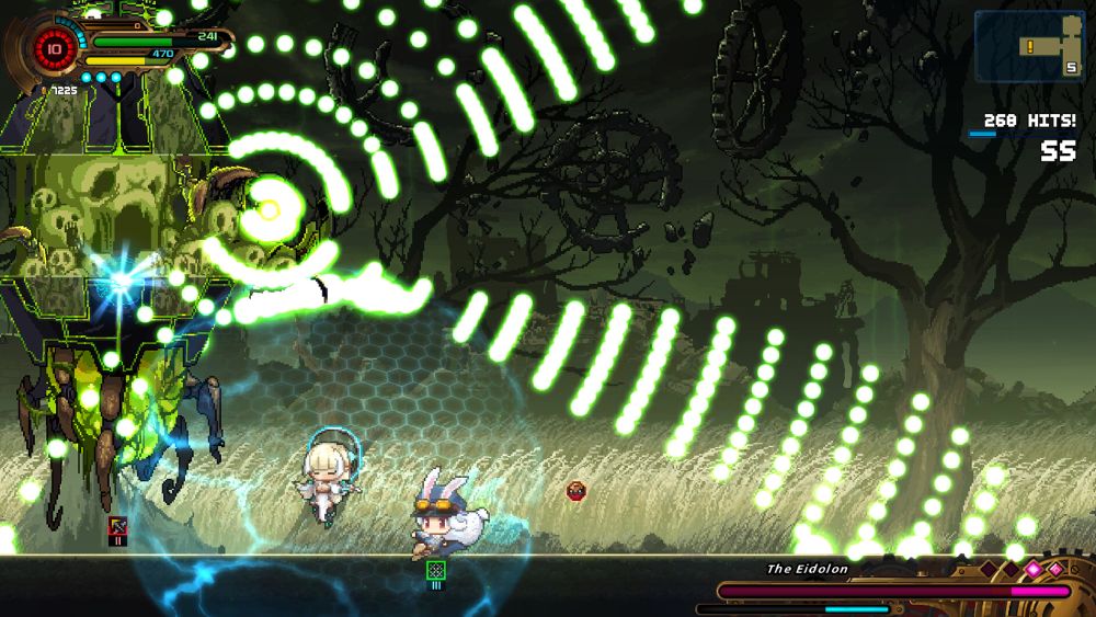 在結合類銀河戰士惡魔城、像素風格、彈幕等要素的 2D 平台探險動作遊戲中,