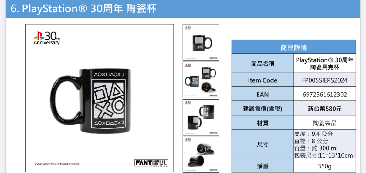 PlayStation 30 週年 陶瓷馬克杯」一個。(約 9.4cm x 8cm,容量約 300ml