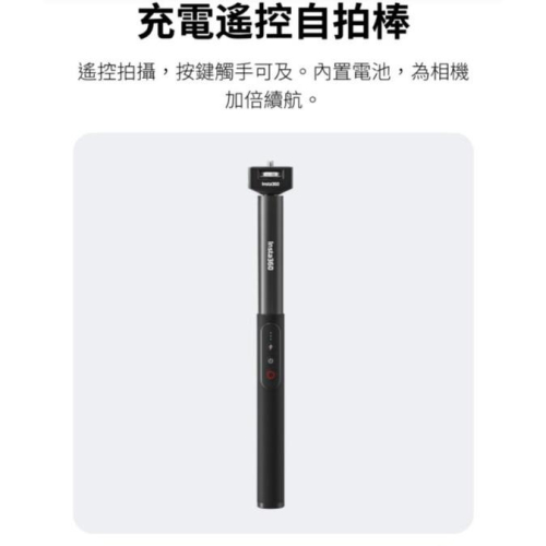 insta 360 原廠 充電遙控自拍棒,內建一枚 4500mAh電池,為相機延長更多續航時間。 用不到二顆電池的錢買近2.5顆電池的容量,又送一支自拍桿真的很划算. 使用有線遙控功能,輕鬆拍攝類似空拍般或第三人稱的視角。內建電池,助力續航。 不防水, 請勿在潮濕環境下或下雨時使用。 自拍桿長度 33-100CM, 有隱形效果, 內建電池,助力續航。 勿直接下單,請在聊聊上先詢問是否有現貨! 充電前請先看說明書使用.若是因為人為因素損壞,恕不換貨,謝謝! 使用說明 1.使用前,請先自拍桿頂部的保護蓋取下。 2.將相機安裝置自拍桿。 將使用相機的觸摸螢幕與自拍桿按鍵保持在同一水平面上,相機(或相機轉接底座)底部螺孔對準自拍桿頂部螺絲,撥動自拍桿的旋鈕,將相機旋緊至自拍桿。 3.使用隨附的Type-C線連接相機與自拍桿。 自拍桿上的快門鍵與電源鍵可控制相機拍攝和關機(自拍桿連結 Insta360 One X3/X2 使用時,電源鍵支援開機)。 連接後,自拍桿將開始對相機充電。 4.拉伸伸縮調節自拍桿的長度。 5.開啟相機,按快門鍵開始拍攝。 *充電:使用前請將自拍桿充滿電。充電時,連接自拍桿手柄處的 USB-C 與 5V/2A 充電器為自拍桿充電。 注意事項 1.本產品不防水,請勿在過於潮濕的環境或者雨天、水中使用。 2.頂端的兩個 USB-C 接口功能相同,請勿同時連接該兩處接口。 4.建議使用場景為手持步行,請勿用於車載,如摩托車、山地車…等。 5.請將相機升級至最新韌體(Firmware)以使用本產品。 6.不使用時請將自拍桿收縮至收納長度。若長時間不使用,電池電量有可能耗盡,請及時充電並開機。 7.本產品內建電池不可拆卸。 原廠介紹,適用於X2,X3,R,RS https://store.insta360.com/product/power_selfie_stick?c=1760 產品介紹影片,可開中文 https://youtu.be/hfZemVUTXz0 請注意: 1新款充電桿已取消底部螺絲洞. 2非產品質量問題,簽收無問題後就無法退貨. 3本充電桿非採藍芽無線和手機遙控,為有線 按鍵和主機遙控. 現場取貨另有優惠!