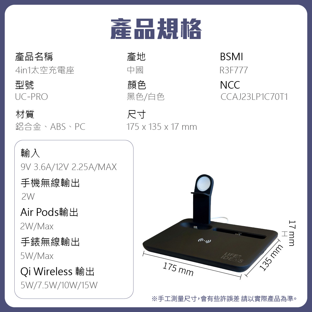 手錶充電支援:Apple Watch 1-9代、SE、Ultra/Galaxy Watch 1-6代、Classic、Pro。