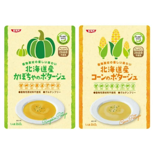 ◆ 只要煮沸或微波就可以吃到像新鮮出爐的湯品 ◆ 懶得做飯時超方便 北海道植物性南瓜濃湯 🎃 這款口味清淡的湯品系列充分利用了北海道蔬菜的鮮美滋味。採用植物性食材,不含麩質,也不含28種特定過敏原,是食物過敏者或素食者的理想之選。湯中加入了米漿、米粉和蔬菜醬,以襯托南瓜的甜美,打造出順滑的口感。 北海道植物性玉米濃湯🌽 這款口味清淡的湯品系列充分利用了北海道蔬菜的鮮美滋味。採用植物性食材,不含麩質,且不含28種特定過敏原,推薦給食物過敏者以及偏好素食的人士。湯品以香甜的北海道玉米為主要原料,搭配芳香蔬菜和高麗菜,海帶的鮮味更增添一絲柔和的口感。