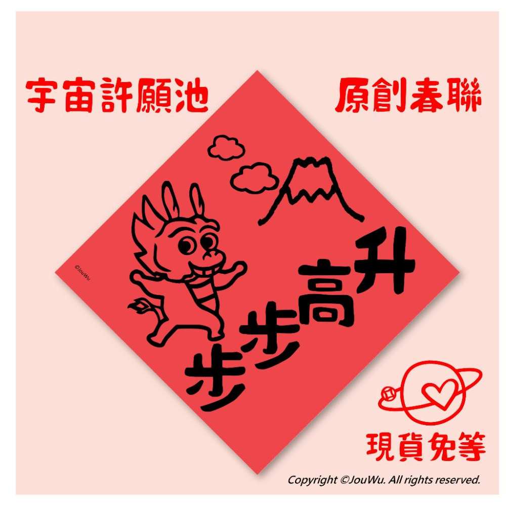 現貨免等 ❤️不正經不傳統的文創春聯 獨家設計 居家風水入宅開市開張動土儀式 媽祖拜拜土地公神明聖誕 一定有你喜歡的 【宇宙許願池】文創設計春聯 喜迎新春,春聯是必不可少的文化之一。 但除了傳統的春聯,現在還有更有趣、更有創意的設計。 這款春聯不傳統、不正經,是由宇宙許願池文創設計團隊精心設計的。 除了可放在家中、大門口或公司辦公室工廠, 也是福委會贈品、禮品包裝、居家生活、招福開運、入宅入厝招財招桃花消災解厄好物 特色: - 原創設計 - 有趣 - 節慶 - 風水 - 開運 立即購買,現貨可快速出貨!不只是您自己使用,也是送給家人、親友的好禮物。同時,歡迎企業客戶福委會業務贈品團購。 除了點綴家居風水、招財招桃花、消災解厄、納財招福和開運,更可以讓你告別單身、戀愛成就,脫魯成功!立即購買,快速出貨,讓你更快擁有開運好日子。 我們的春聯採用正方形設計,進口120磅紙印刷 約21 x 21cm大小, 可單張直購。 出貨方式為超商取貨付款,方便快捷。 🎉🎉🎉歡迎企業客戶福委會業務贈品團購🎉🎉🎉 趕快入手這款春聯吧!告別單身、戀愛成就、脫魯成功,還有開運招財、桃花運、愛情,讓您新的一年,好運連連! 除了春聯,我們還提供各種吉祥話、紅包和紅包袋等開運小物,讓你的年節更加精彩!快來選購吧! 現貨!可快速出貨~立即購買!立即購買! #告別單身 #戀愛成就 #脫魯成功 #不傳統春聯 #春聯 #風水 #開運 #桃花 #文創 #設計 #文創設計 #雜貨 #行天宮 #吉祥話 #紅包 #紅包袋 #愛情