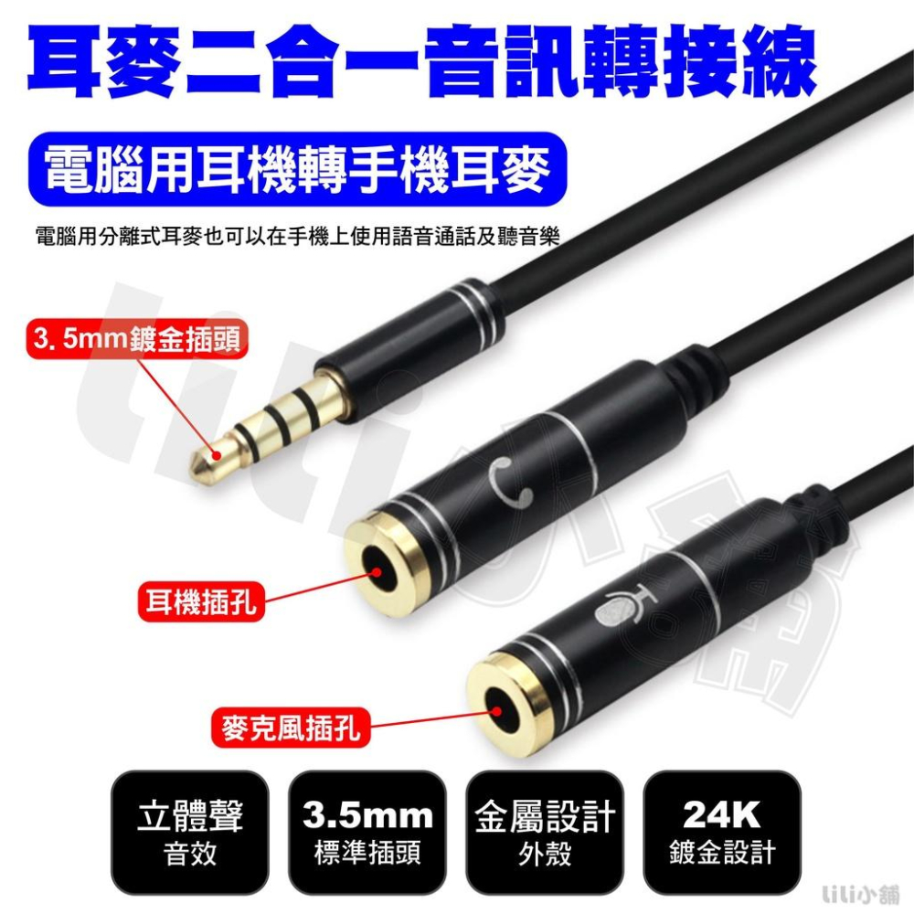 溫馨提醒: 如果不知道您的設備要使用哪一款,請用聊聊詢問我們,謝謝!! 商品特色: ✨一(公)對二(母)轉接線,可將電腦用耳麥轉為手機、平板、單孔耳麥筆電使用。 ✨二(公)對一(母)轉接線,手機用耳麥輕鬆變成電腦、筆電耳麥。 ✨採用無氧銅線材,無氧銅導體線材+鋁箔纏繞,傳輸穩定、音源傳輸不失真。 ✨音頻雙3.5插頭設計,完美兼容音頻設備,隨時享受語音樂趣。 ✨鋁合金外殼+高純度3.5mm鍍金接頭,高立體聲,有效降低電磁波干擾。 商品內容: 1.線長:約33 cm 2.淨重:約 8 g 3.線芯:純銅線芯 3.材質:鋁合金+TPE環保材料 4.顏色:黑色、藍色、銀色 5.規格: 【二公一母】3.5mm母孔x1、耳機插頭x1、麥克風插頭x1 📌適用範圍:筆記型電腦、桌機電腦(不支持蘋果、beats耳機) 【一公二母】耳機孔x1、麥克風孔x1、3.5mm插頭x1 📌適用範圍:手機、平板電腦、筆記型電腦(單孔)