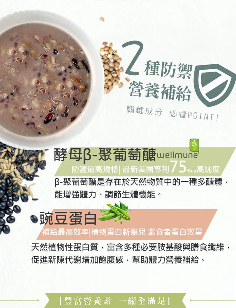 內容物名稱(成分):水、豌豆蛋白、冰糖、黑米、黑豆、燕麥仁、紅薏仁、紅藜麥、黑芝麻、β-聚葡萄糖(wellmune)