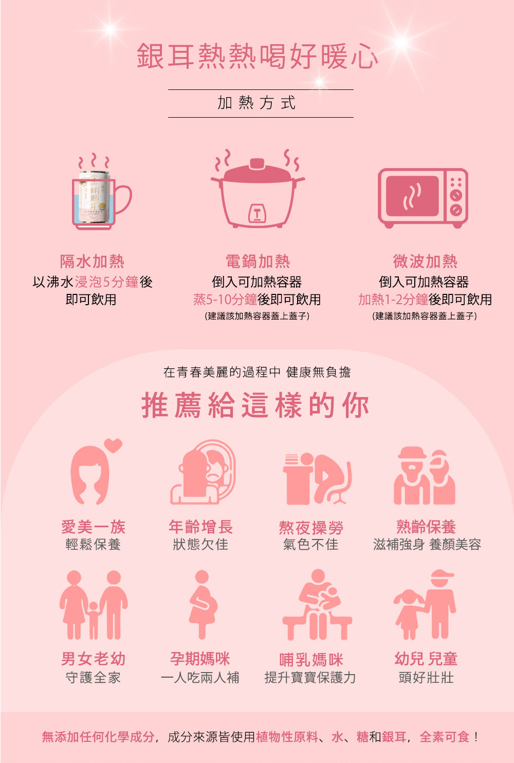 3.內容物名稱(成分):水、銀耳、冰糖、玉米來源可溶性纖維、玉米胚芽抽出物(糊精、玉米胚芽抽出物(含賽洛美))、流行鏈球菌發酵物(含透明質酸鈉)