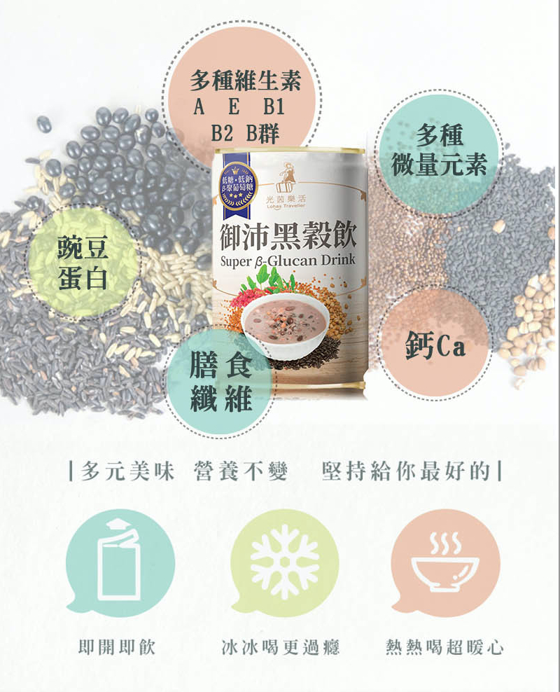 1.商品組合/規格:光茵樂活 御沛黑穀飲(280公克x6罐/盒)