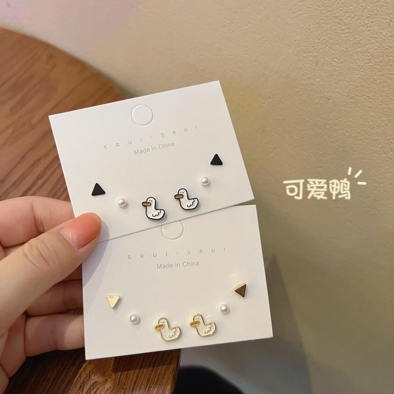 s925銀針日韓可愛卡通小鴨子幾何耳釘套裝女學生小眾設計耳環耳飾