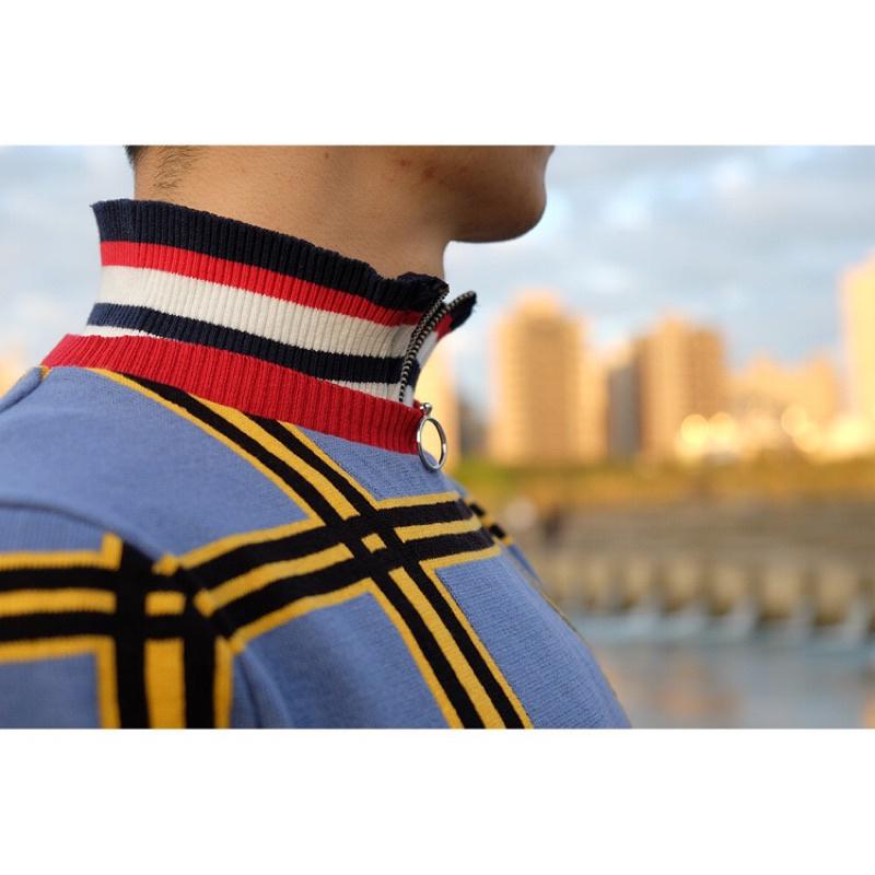 #ASOS #天藍色 #撞色 #色塊拼接 #黃黑格紋 #紅色圓領 #長袖 #針織衫 #XS #現貨