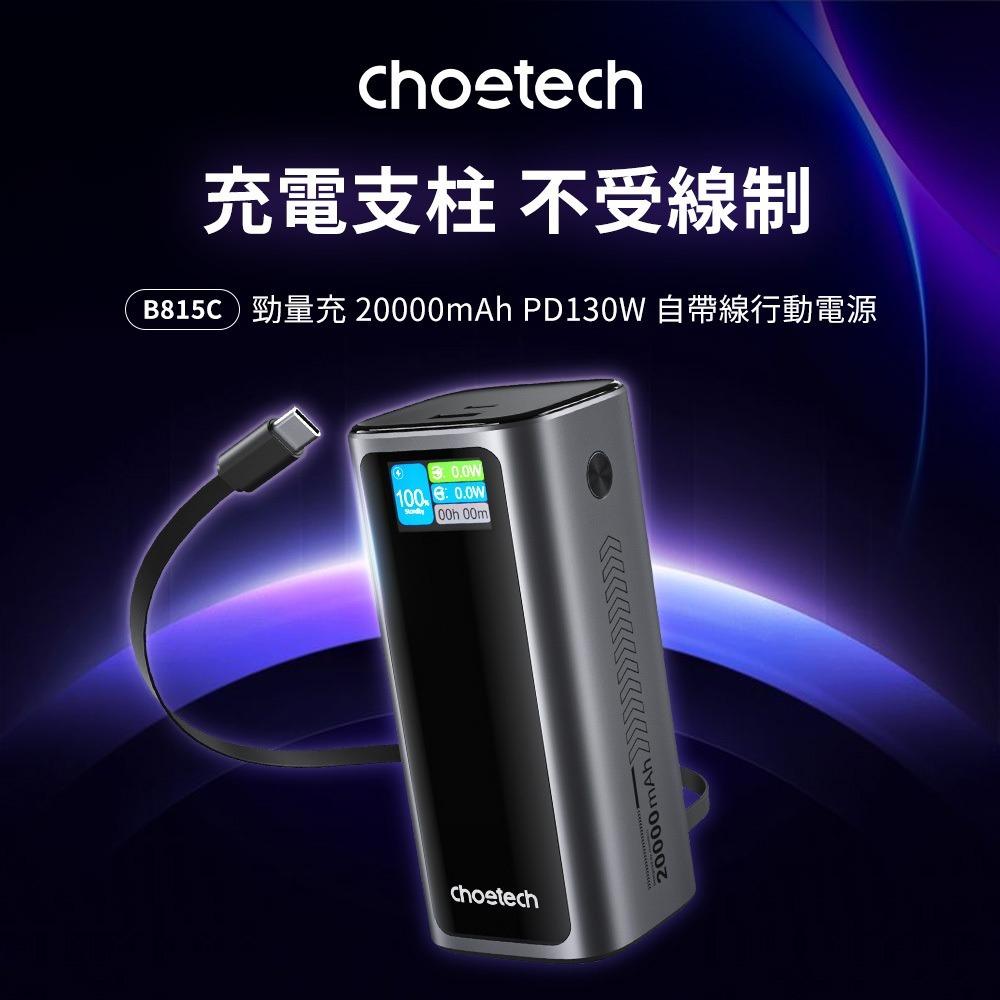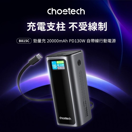 https://s-cf-tw.shopeesz.com/file/tw-11134208-81ztk-mjjpcr594uf592 Choetech 狠能充 PD130W 20000mAh 行動電源 行充 行動充 充電寶 行動充電 移動電源 Choetech 狠能充 PD130W 20000mAh 行動電源 行充 行動充 充電寶 行動充電 移動電源 【商品特色】 超大功率 瞬間補電 C線/C孔最高 100W 輸出,筆電、平板、手機都能充 自帶線材 隨走隨充 60cm線長,多段可調,同時支援輸出與輸入充電 強勁輸出 效率至上 最多支援三款裝置同時快充,在外辦公永不斷電 20000mAh 超大容量 可替 MacBook Pro 14” 充電 60%,iPhone 17 充 3.4 次 資訊掌握 一覽清晰 智慧螢幕可顯示電量狀況、輸入輸出瓦數等多種即時資訊 自帶支架 釋放雙手 手機支架隱藏於機身背面,翻開就能自在使用 可上飛機 出國無憂 有CCC認證 電池容量僅 74wh,符合國際民航組織限制,安心上機 【產品規格】 🔹商品名稱:Choetech 狠能充|20000mAh PD130W 筆電快充自帶線行動電源 B815C 🔹型號:B815 🔹內容物:產品,說明書 🔹保固:24個月(寄回判定人為損壞除外) 🔹貨源:原廠公司貨 【技術規格】 🔹重量:516g 🔹產品尺寸:12.38*5.36*5.36cm 🔹自帶線功能:O 🔹自帶線類型:USB-C 🔹無線充電功能:X 🔹是否支援小電流模式 :O /長按2秒 🔹電池類型:(圓柱)鋰離子電池,INR21700-50E 🔹電池容量:20000mAh/3.7V/74Wh 🔹額定容量:5V/12000mAh,9V/6900mAh,12V/5000mAh,15V/4000mAh,20V/3000mAh 🔹輸入電壓:USB-C / USB-C Cable: 5V⎓3A,9V⎓3A,12V⎓3A,15V⎓3A,20V⎓3.25A 🔹輸出:USB-C / USB-C Cable: 5V⎓3A,9V⎓3A,12V⎓3A,15V⎓3A,20V⎓5A;USB-A:5V⎓3A,9V⎓3A,10V⎓2.25A,12V⎓2.5A 🔹最大輸出:130W 🔹輸出接口標示:USB-C / USB-C Cable / USB-A 🔹輸入接口:USB-C / USB-C Cable 🔹快充協議:PD3.0、 PD2.0、QC4.0、QC3.0、SCP、FCP、 AFC、PPS https://s-cf-tw.shopeesz.com/file/tw-11134208-81zti-mjjpcr5968zl99 https://s-cf-tw.shopeesz.com/file/tw-11134208-81ztg-mjjr68ywo1zb7f https://s-cf-tw.shopeesz.com/file/tw-11134208-81ztm-mjjr68ywpgjrac https://s-cf-tw.shopeesz.com/file/tw-11134208-81zte-mjjr68ywqv47ec https://s-cf-tw.shopeesz.com/file/tw-11134208-81zti-mjjr68yws9on1c https://s-cf-tw.shopeesz.com/file/tw-11134208-81ztm-mjjr68ywto937e https://s-cf-tw.shopeesz.com/file/tw-11134208-81ztp-mjjr68ywv2tj82 https://s-cf-tw.shopeesz.com/file/tw-11134208-81ztq-mjjr68ywwhdzfa