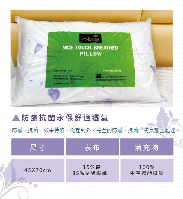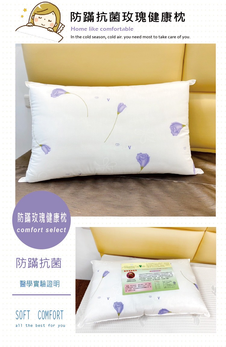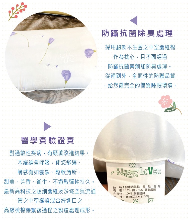 採用超軟不生菌之中空纖維棉作為枕心,且布面經過防螨抗菌藥劑加防臭處理。