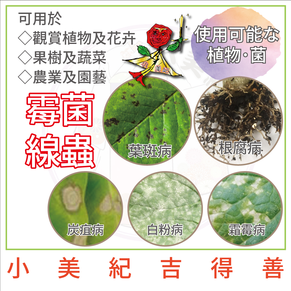 *植株病菌類:灰黴病、白粉病、霜霉病、猝倒病、炭疽病、葉斑病、根腐病、銹病、黑星病、霉菌…..常見病菌類。