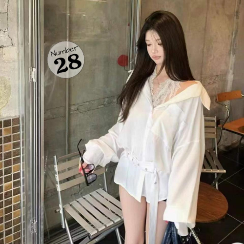 Number28 - (附腰帶)兩件式上衣 蕾絲背心+長版白襯衫 286303