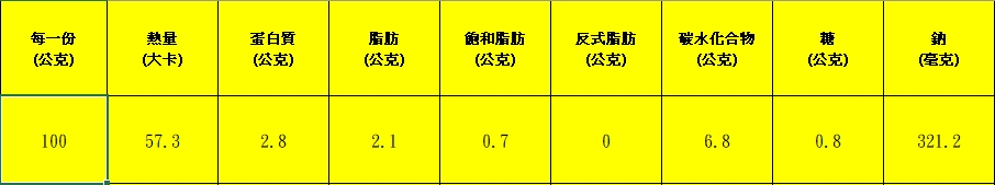 成分:排骨酥【豬排骨(台灣)、大豆分離蛋白、蕃薯粉、糖、食鹽、醬油、麥芽糊精、乾酪素鈉、多磷酸鈉、焦磷酸鈉(無水)、L-麩酸鈉、DL-胺基丙酸、5'次黃嘌呤核苷磷酸二鈉、5'鳥嘌呤核苷磷酸二鈉、琥珀酸二鈉、香辛料(肉桂、小茴、大茴、丁香、甘草)、肉桂香料(酵母精粉、乳糖、食鹽、醬油粉、植物水解蛋白(大豆、玉米、小麥)、胺基乙酸、精緻芥花油、砂糖、棕櫚油、豬肉抽取物、洋蔥粉、葡萄糖、香料、D-木糖、二氧化矽、乙基麥芽醇、甘草素(甜味劑)、檸檬酸鈉】、大白菜、芋頭、豬腳丁(加拿大)、鳥蛋、豬肚(法國)、金蘭醬油、二砂、大骨粉(L-麩酸鈉、胺基乙酸、琥珀酸二鈉、5'次黃嘌呤核苷磷酸二鈉、5'鳥嘌呤核苷磷酸二鈉)、麥芽糊精、糖、豬肉粉(乳糖、醬油粉、植物水解蛋白(大豆、玉米、小麥)、DL-胺基丙酸、精製芥花油、豬肉抽取物、葡萄糖、D-木糖)、洋蔥粉、品質改良劑(二氧化矽)、香料、甘草、薑母、當歸(調味用)、白胡椒】、馬鈴薯澱粉、僞魚翅(食用海藻膠、食用明膠、黃槴子色素、水)、烏醋〔水、釀造米酢、糖、鹽、胡蘿蔔汁、洋蔥汁、番茄汁、柳橙汁、焦糖色素(普通焦糖/著色劑)、香料〕、栗子、蒜仁、紅棗、香菇絲、鹽、香油(大豆油、芝麻油)。