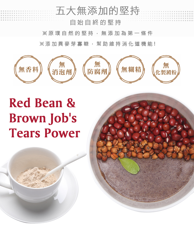 成份:紅豆(50.4%)、紅薏仁(33.6%)、低聚異麥芽寡糖(16%)