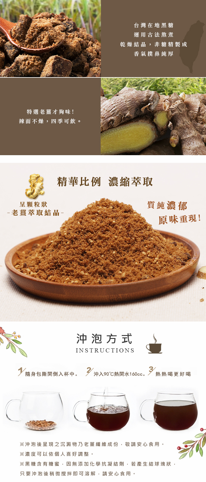 1. 沖泡後呈現之沉澱物乃老薑纖維成份,敬請安心食用。