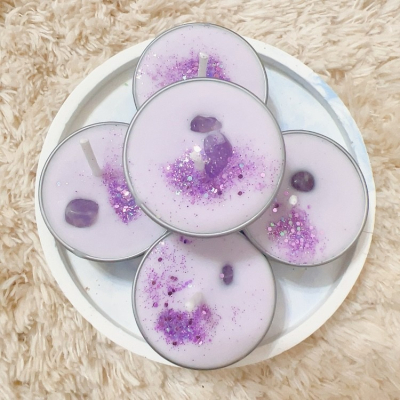 =好貴人小茶燭= 好貴人小茶燭4入$400 💛每顆小茶燭使用大豆植物蠟製成 💛每顆都有紫水晶幫忙招來好貴人、開智慧 💛每顆約燃燒2-4小時 💛每顆水晶都可以擦拭後使用小疊子裝著,讓水晶繼續幫助你哦!! 紫水晶 ✔社交之石 ✔對應眉輪 ✔紫水晶主「智慧」與「財富」 ✔廣結人緣,助貴人緣 ✔開發智慧 、激發創意、增加信心 ✔加強記憶力 ✔鎮定安神 ✔提升領導力 【使用方式】 1.捧在手心,閉上眼睛,在心裡念出自己的名字,並感謝它來幫肋你,帶來好貴人來身邊,以及開智慧把工作處理的很圓滿 2.點燃它 【注意事項】 🔅使用時下方記得墊著燭盤或杯墊,比較安全哦! 🔅使用明火請小心!附近請不要放置雜物,週圍遠離易燃物哦 🔅保持室內的空氣流通哦 🔅小茶燭一次點完