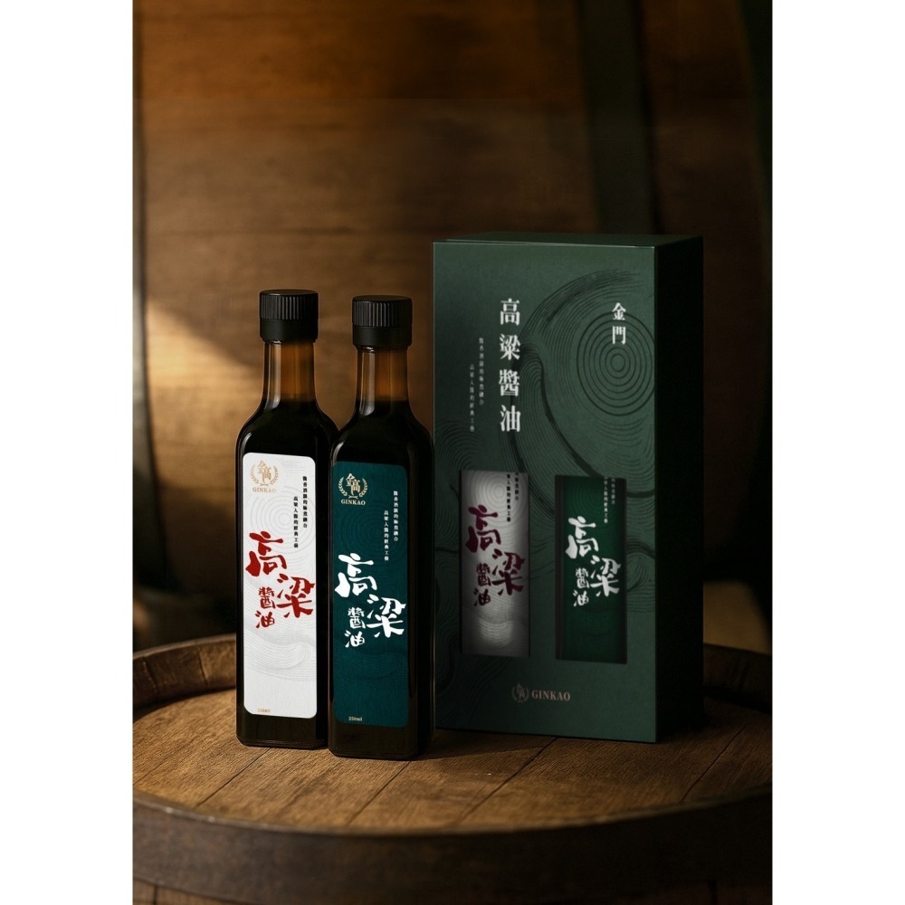 結合高粱酒香與黑豆釀造歷經180天日曝夜露並加入高粱酒配方調味,將酒香與豆香完美結合,醬體色澤如琥珀,入口醇厚飽滿,帶有高粱香氣與發酵麴香、尾韻回甘,市面上唯一具有金門風味的「高粱醬油」。