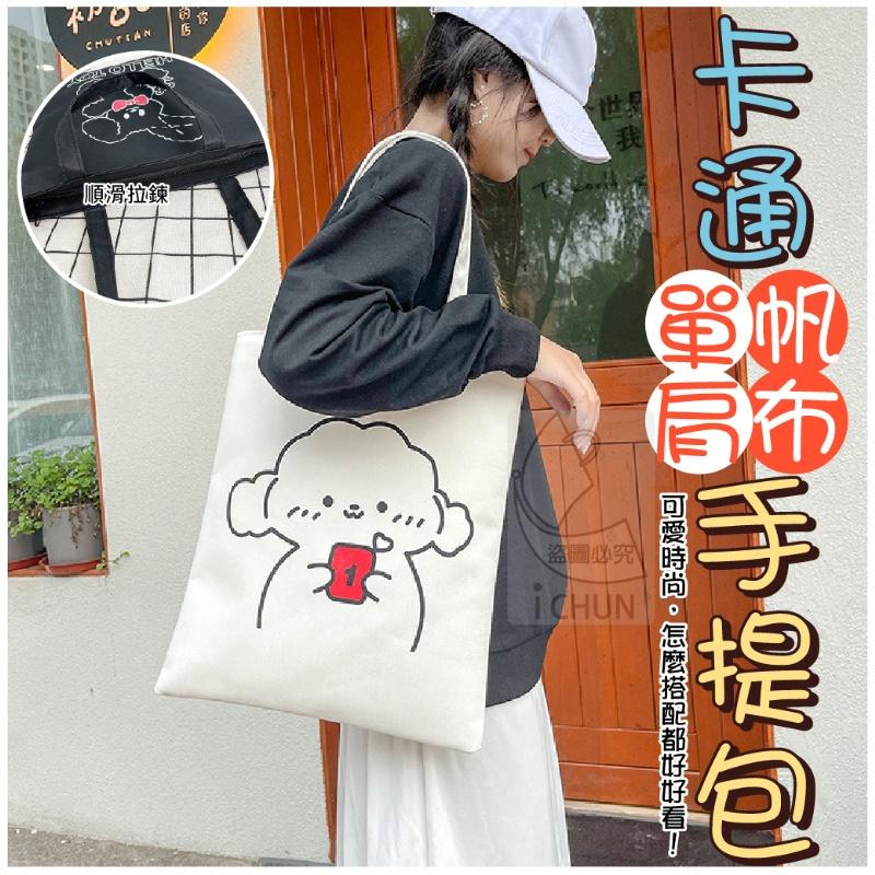 【現貨】卡通帆布包 側背包 單肩包 上課上學用 質感 購物袋 簡約質感環保袋 可愛圖案小清新 拉鍊拉鏈 學生袋