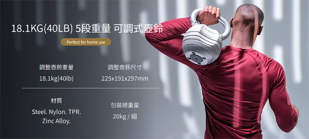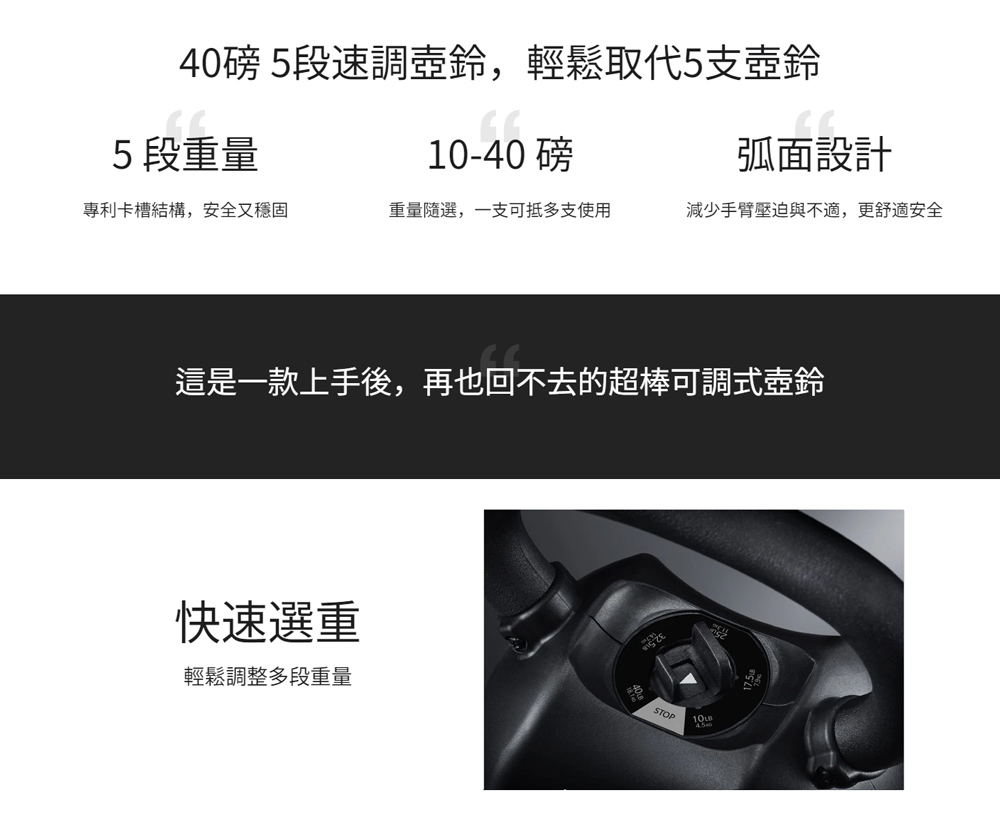 讓您輕鬆取代5支壺鈴 這是一款上手後,再也回不去的超棒調整式壺鈴,重訓路上,請您考慮壺鈴的CP值、收納性、時尚態度!
