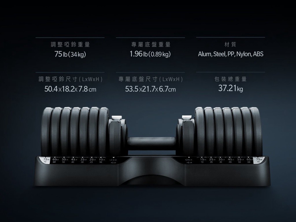 重量調整 10、12.5、15、20、22.5、25、30、32.5、35、40、42.5、45、50、52.5、55、60、62.5、65、70、72.5、75LB,共21段重量