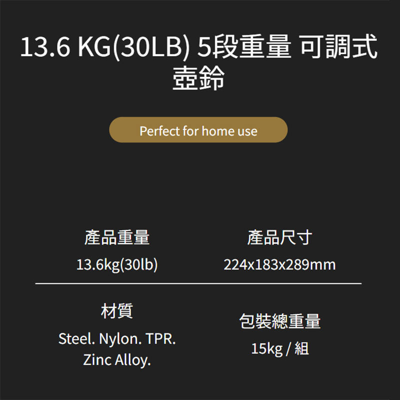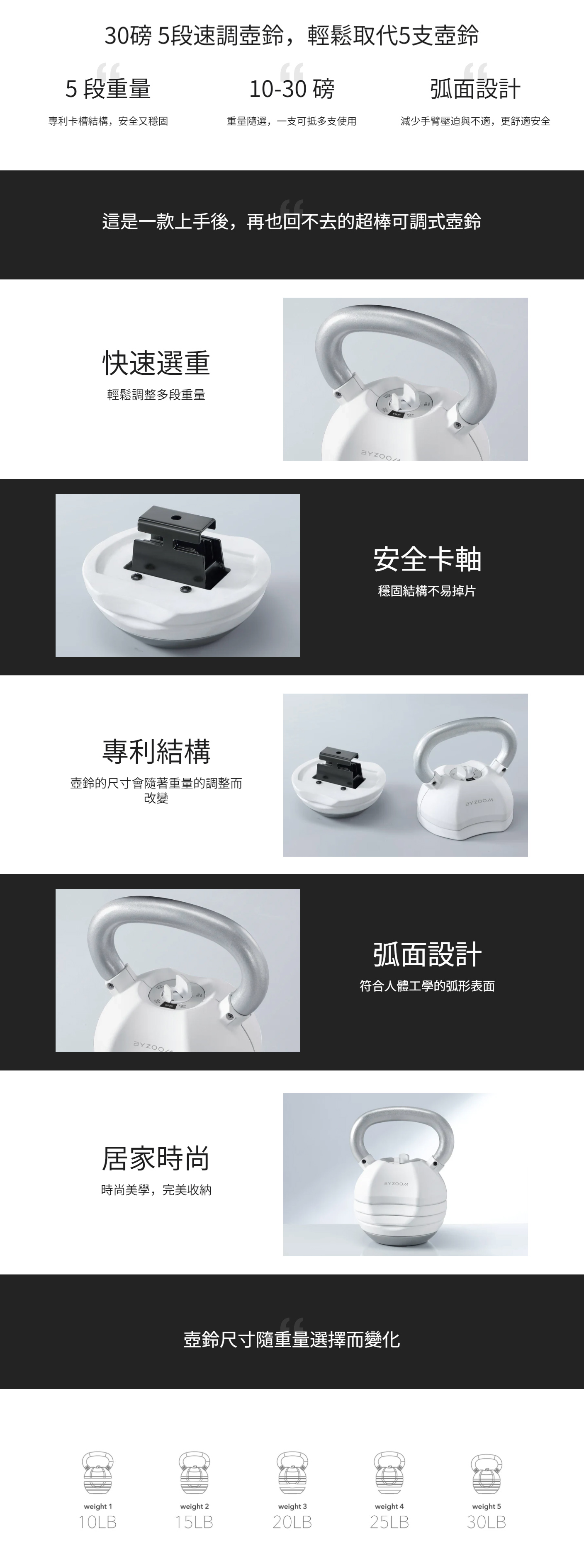 10、15、20、25、30LB 五段重量秒速調整,5 in 1 可調式壺鈴