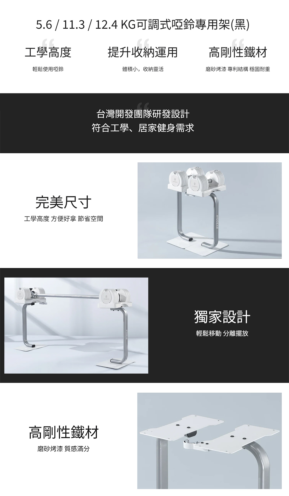 | 可調快拆式設計 | 重量隨選,一支可抵多支使用 | 收納底座,方便、不佔空間 |