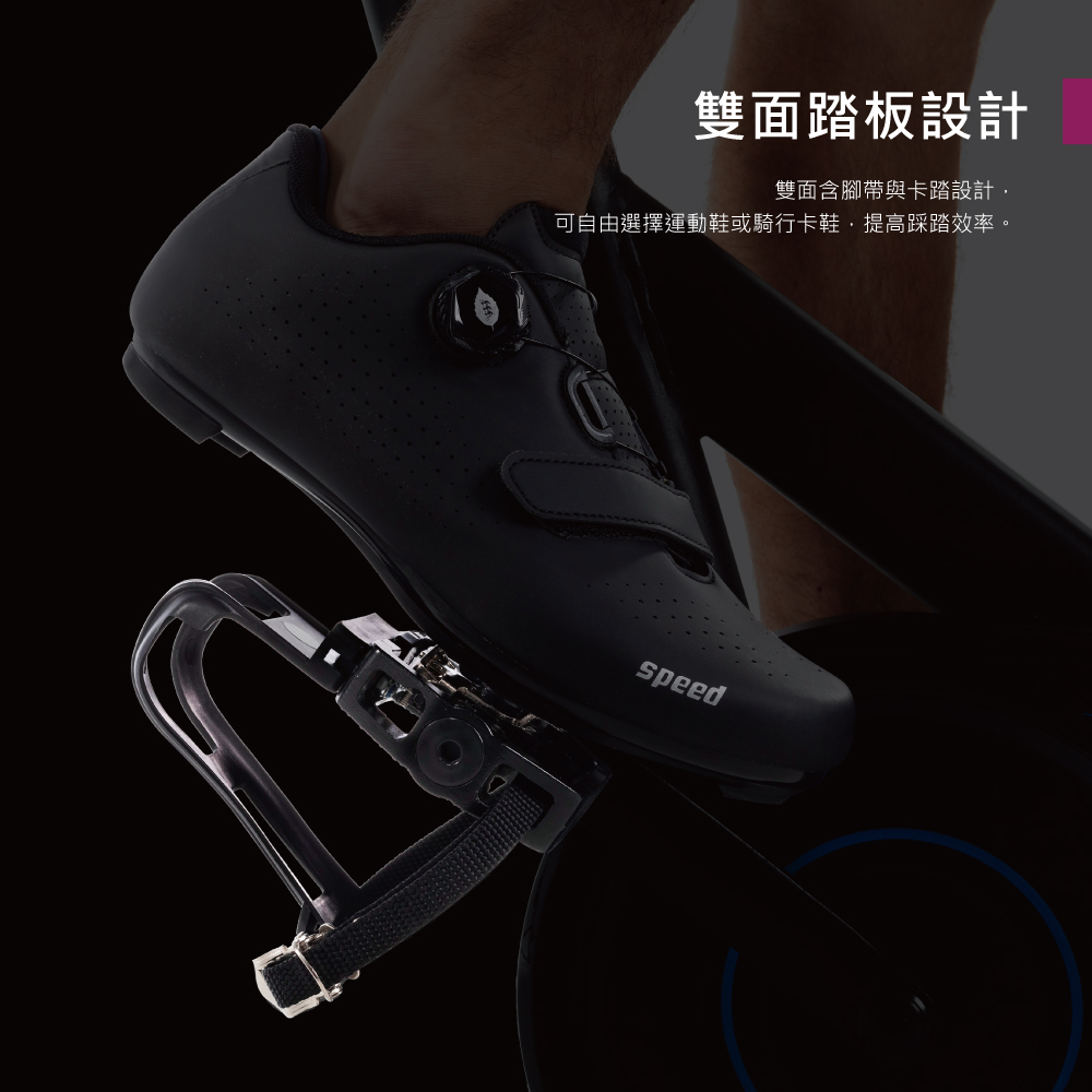.雙面踏板設計,含狗嘴套腳帶與卡踏設計