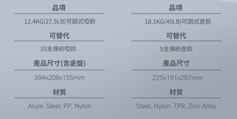 商品包含:12.4kg(27.5LB) 調整啞鈴X1支+專屬啞鈴底座 X1個