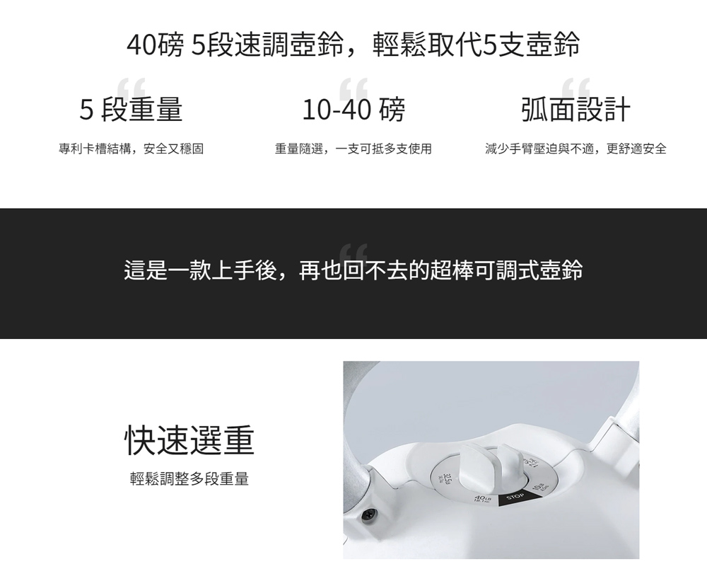 可從 4.5 kg - 18.1 kg 做共5種簡易重量調整