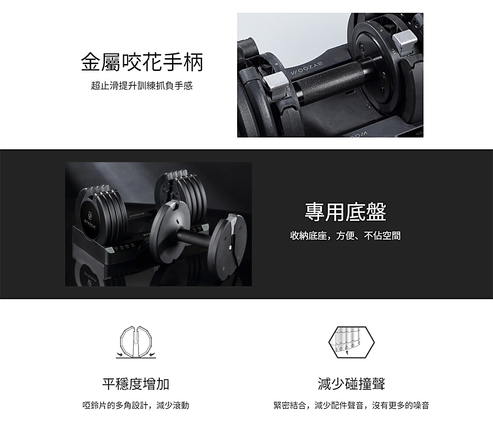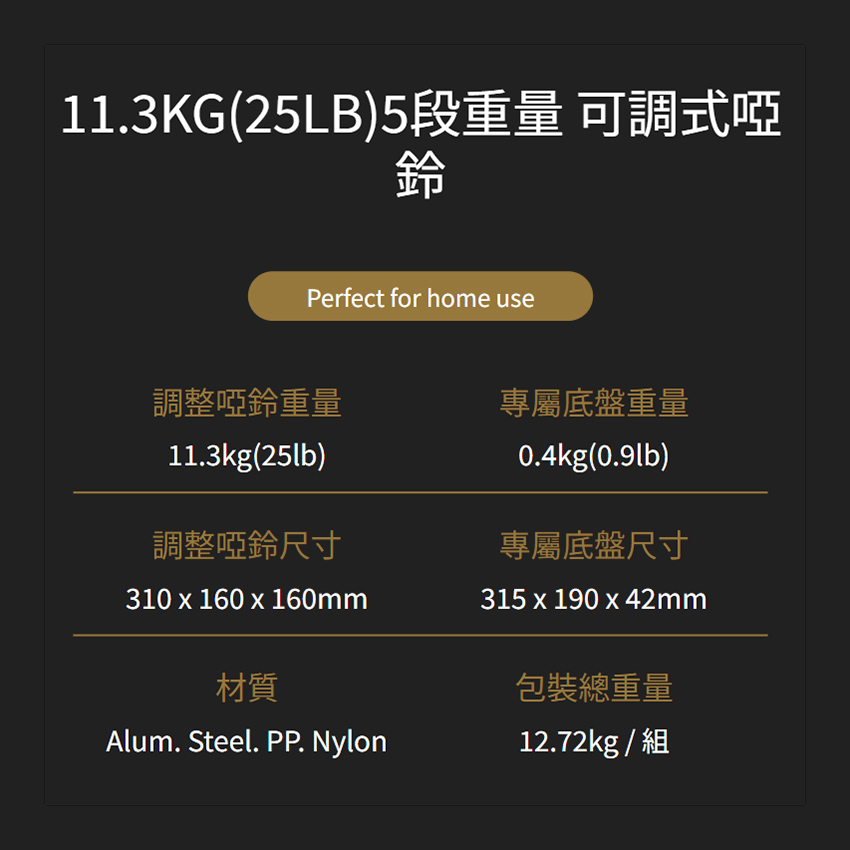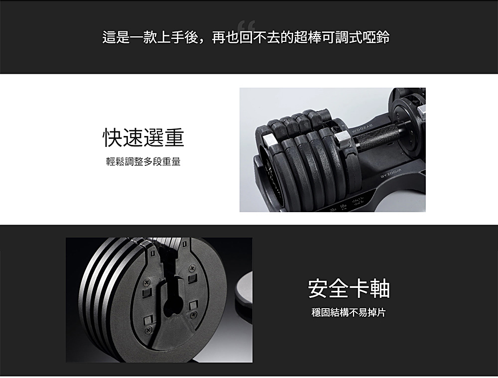 | 台灣開發團隊研發設計的BYZOOM FITNESS 25LB 可調式啞鈴 可從5 LB ~ 25 LB做共 5 種簡易重量調整 不論是剛開始運動的初階使用者或是進階的居家訓練者皆可針對不同肌群輕鬆調整適合重量, 一組調整壺鈴即可滿足多個使用者重量的需求,在家隨時想運動就運動,懶惰外出運動從此不再是藉口。 |