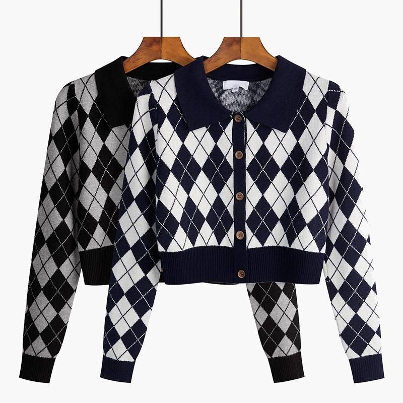 MD:花花(150/46/藏青) 簡約的菱格撞色設計,針織材質彈性很好,版型也很挺,上衣長度做成短款,非常的有個性,150穿上可以露出肚臍!