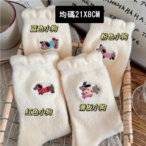 奶油色小狗刺繡厚襪 女生保暖襪 藍/粉/紅/滑板狗