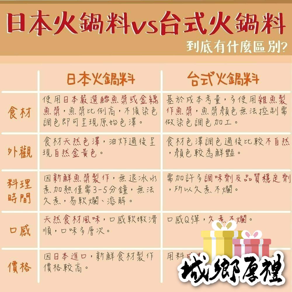 成份:魚肉(金線魚、鱈魚)、澱粉(馬鈴薯、樹薯)、風味原料(蟹精)、砂糖、食鹽、蛋白(雞)、調味劑(胺基乙酸)、香料、天然色素(胡蘿蔔素)