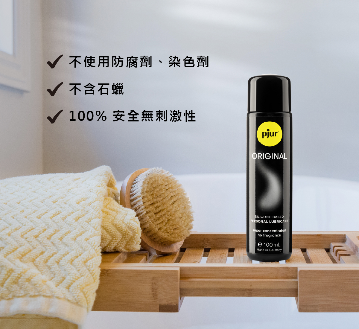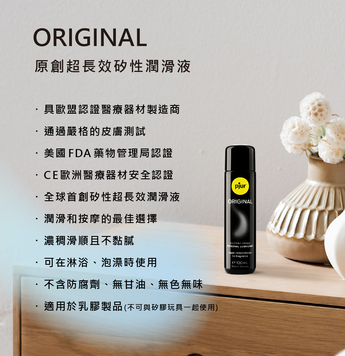 pjur ORIGINAL 經美國 FDA 核准,通過嚴格的皮膚醫學敏感測試,不使用防腐劑、染色劑、不含甘油,無色無味、不含香精,100% 安全無刺激性,可安心每天使用。