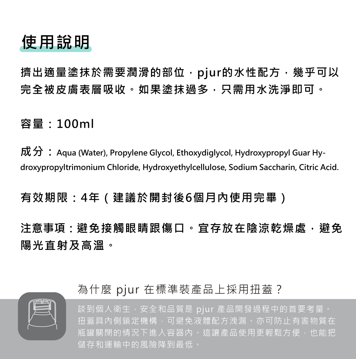 所有的pjur 產品均通過嚴格的皮膚醫學敏感測試,Woman Nude 不使用染色劑、無色無味,100% 安全無刺激性,可安心每天使用。