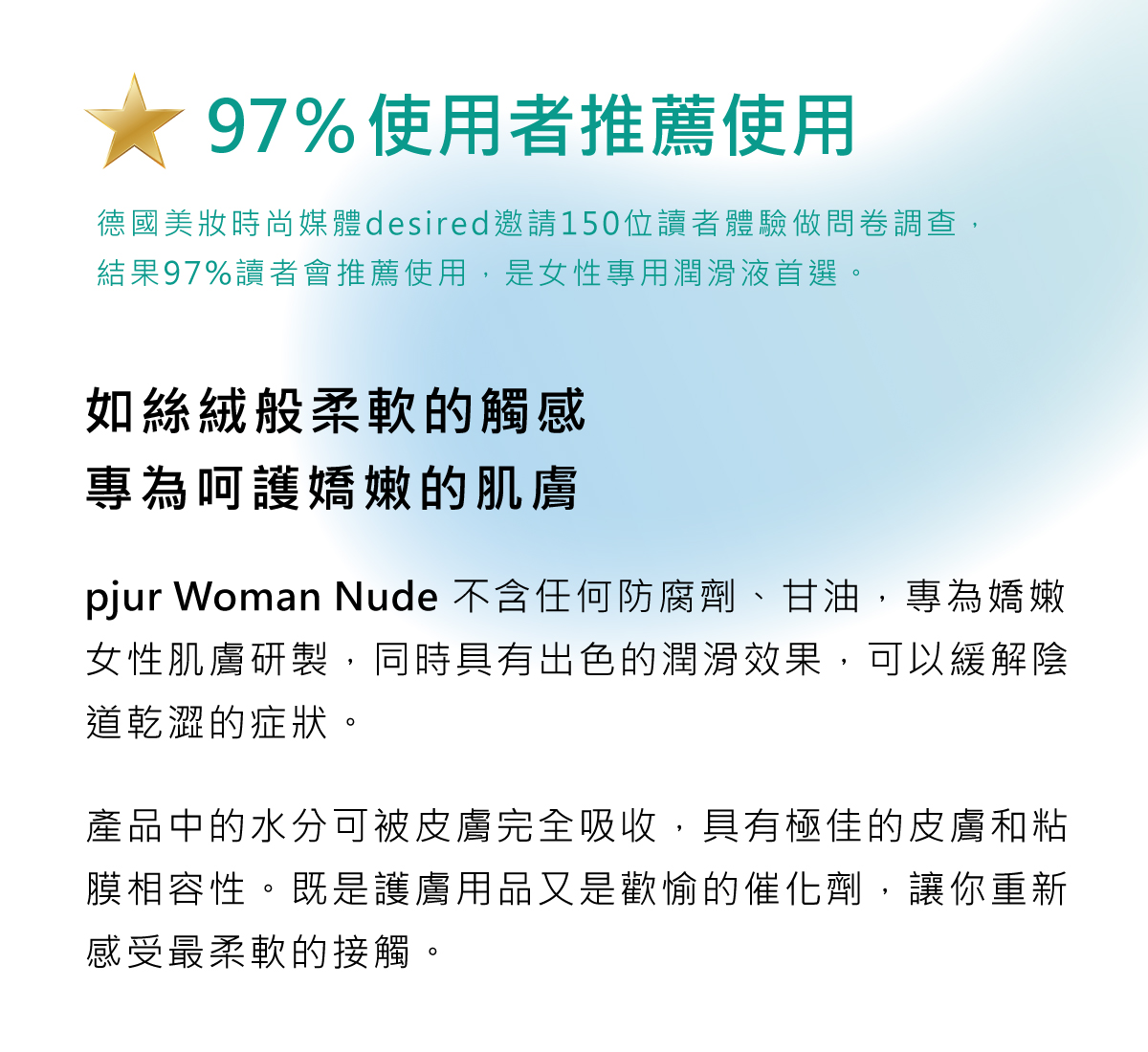 pjur Woman Nude 不含任何防腐劑、甘油,專為嬌嫩女性肌膚研製,同時具有出色的潤滑效果,可以緩解陰道乾澀的症狀。產品中的水分可被皮膚完全吸收,具有極佳的皮膚和粘膜相容性。如絲絨般柔軟的觸感,完全不黏膩,為皮膚提供溫和持久的呵護。