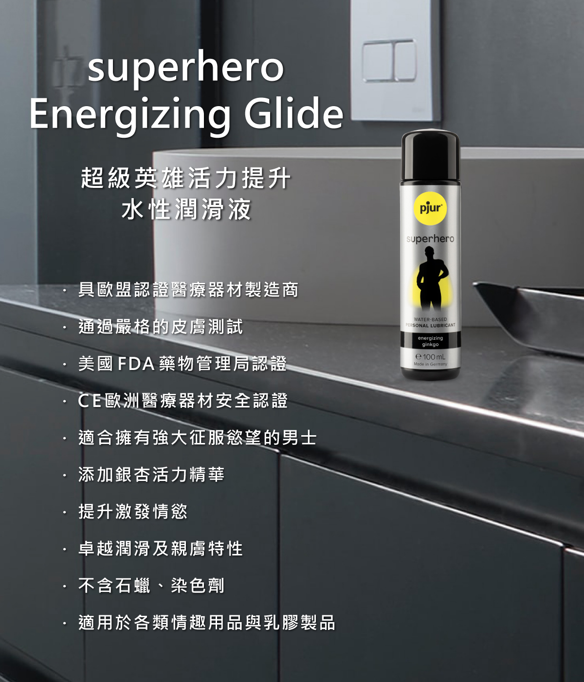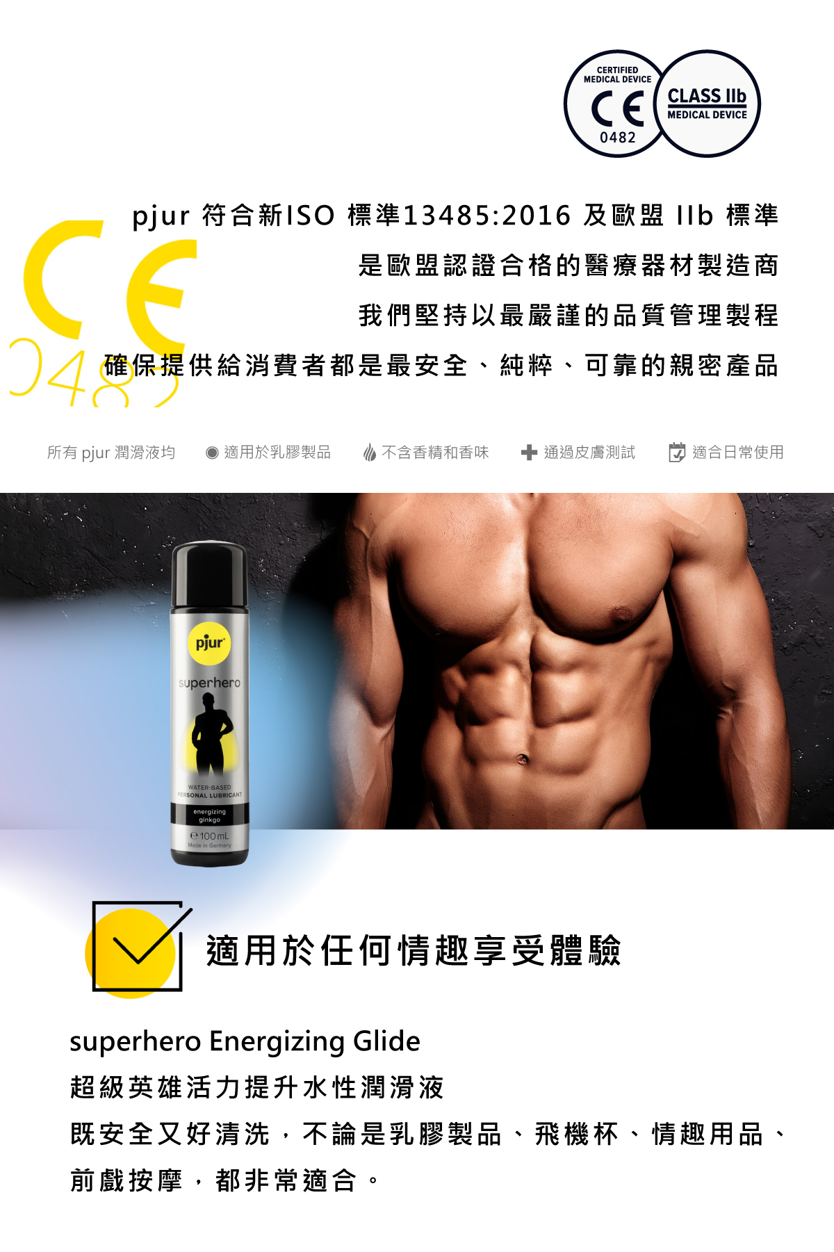 所有的pjur 產品均通過嚴格的皮膚醫學敏感測試, superhero Energizing Glide 不使用防腐劑、染色劑,不含石蠟,無色無味,100% 安全無刺激性,可安心每天使用。