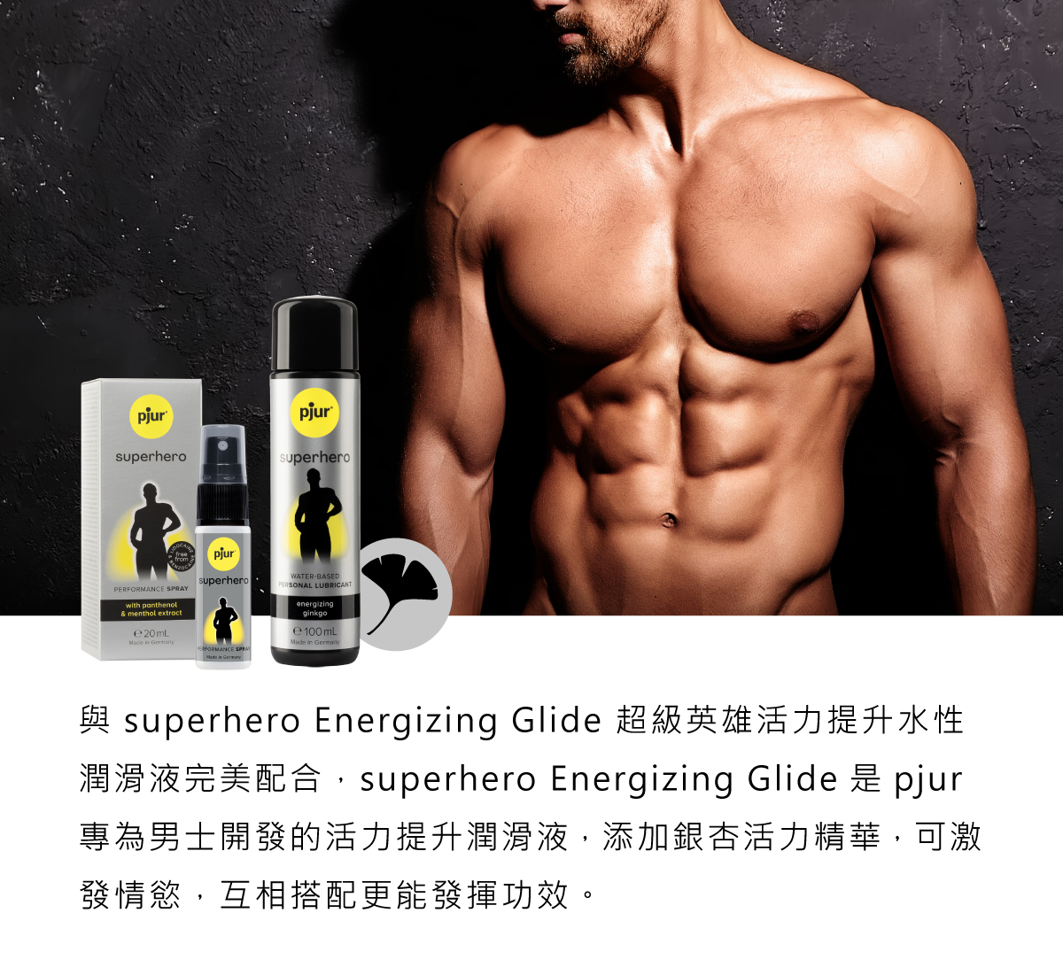 與 superhero Energizing Glide 超級英雄活力提升水性潤滑液完美配合,superhero Energizing Glide 是pjur 專為男士開發的活力提升潤滑液,添加銀杏活力精華,可激發情慾,互相搭配更能發揮功效。