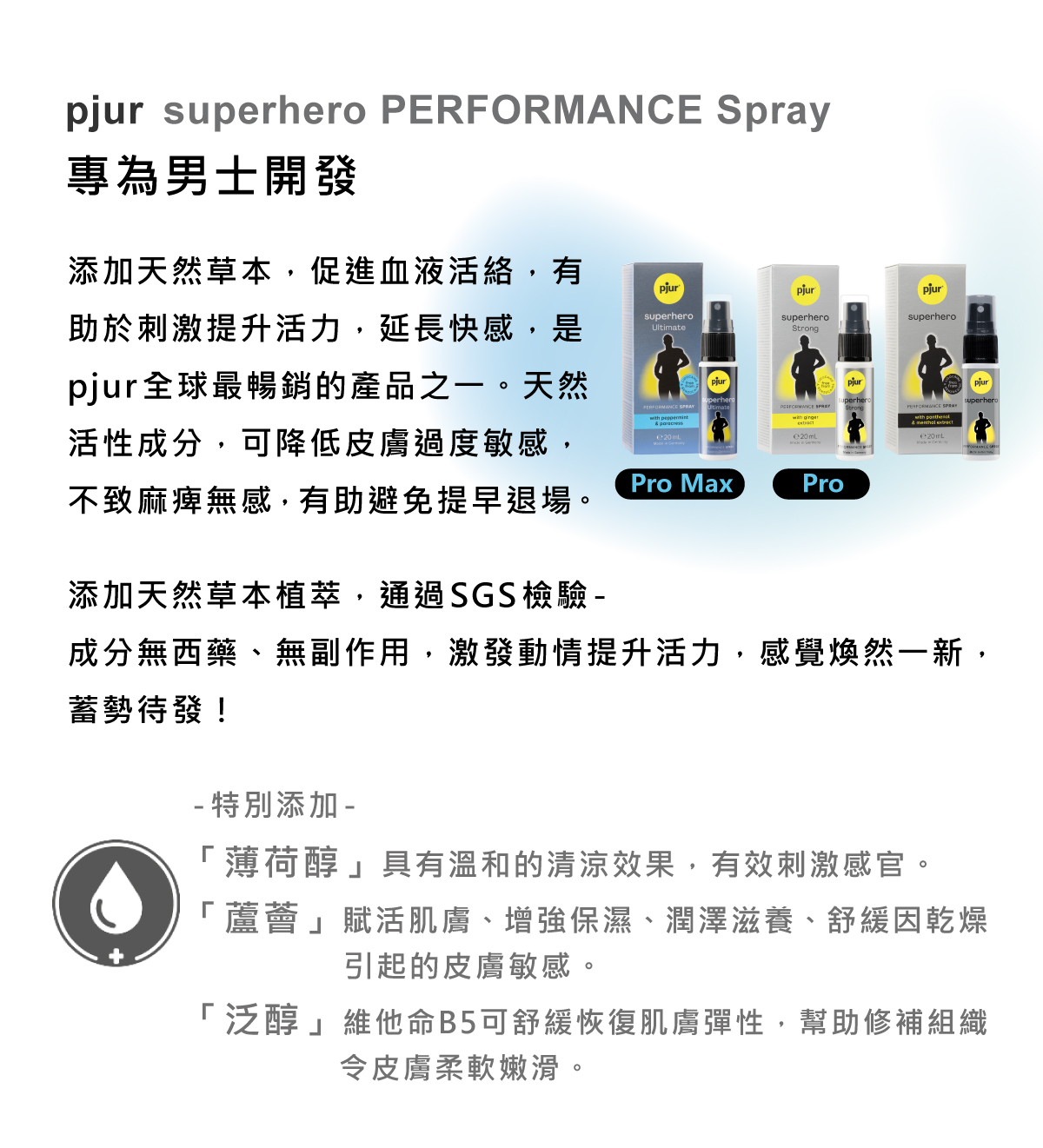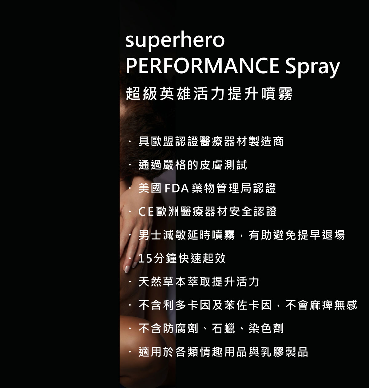 專為男士開發的 superhero PERFORMANCE Spray 添加天然草本,促進血液循環,有助於刺激提升活力,延長快感,是pjur 全球最暢銷的產品之一。其天然活性成分,可降低皮膚過度敏感,不致麻痺無感,有助避免提早退場。不含利多卡因和苯佐卡因等麻藥成分,不會積聚於體內,絕對安全。15分鐘快速起效,無需等待,迅速滲透表皮並吸收。