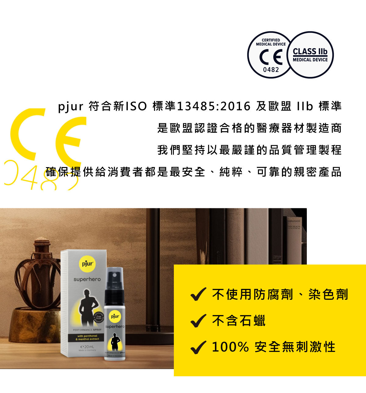 所有的pjur 產品均通過嚴格的皮膚醫學敏感測試, superhero PERFORMANCE Spray 不使用防腐劑、染色劑,不含石蠟,無色無味,100% 安全無刺激性,可安心每天使用。