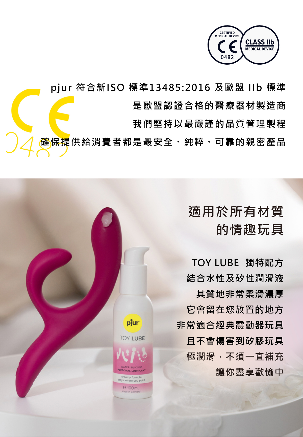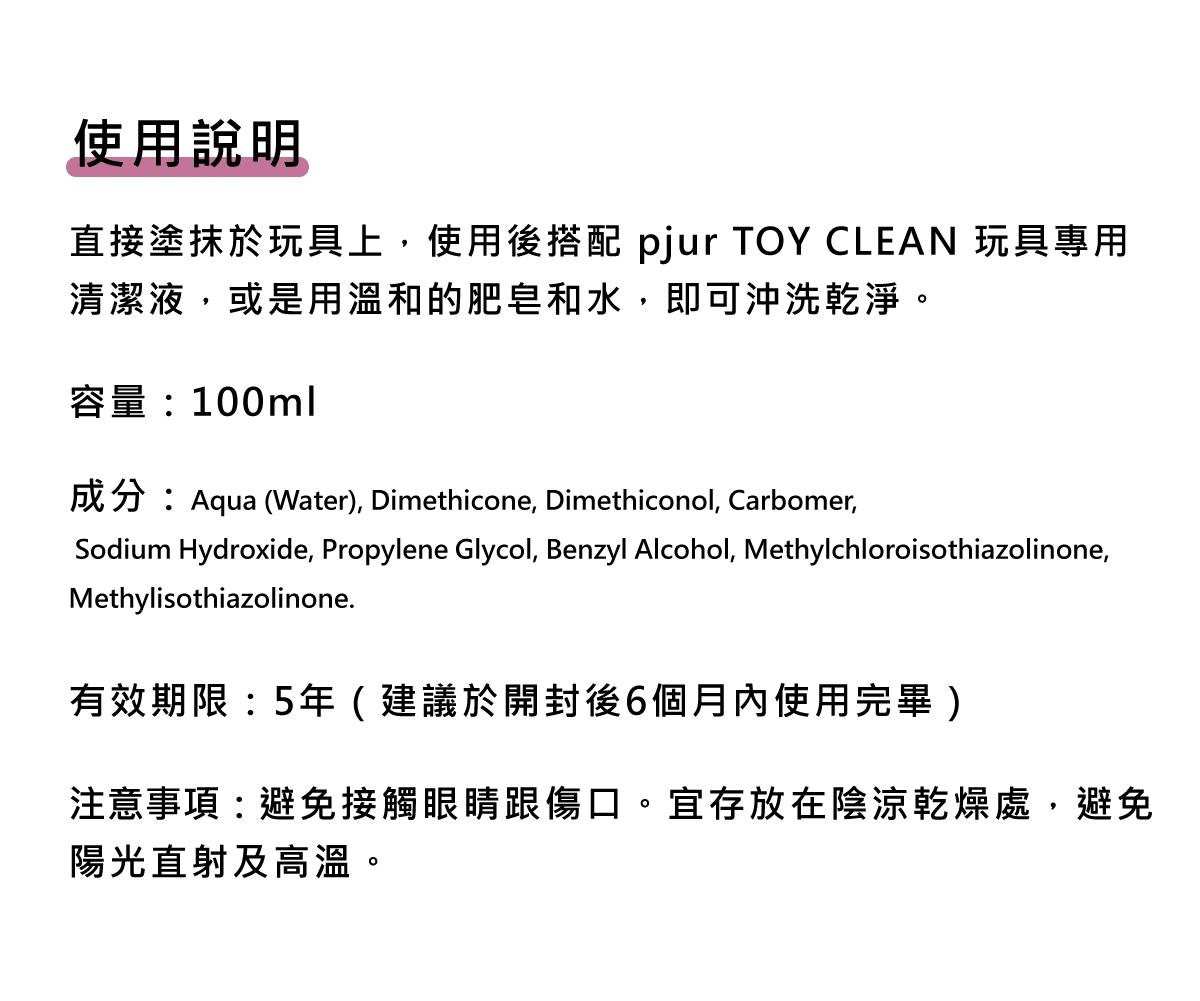 所有的pjur 產品均通過嚴格的皮膚醫學敏感測試,TOY Lube 不使用防腐劑、染色劑,不含石蠟,無色無味,100% 安全無刺激性,可安心每天使用。
