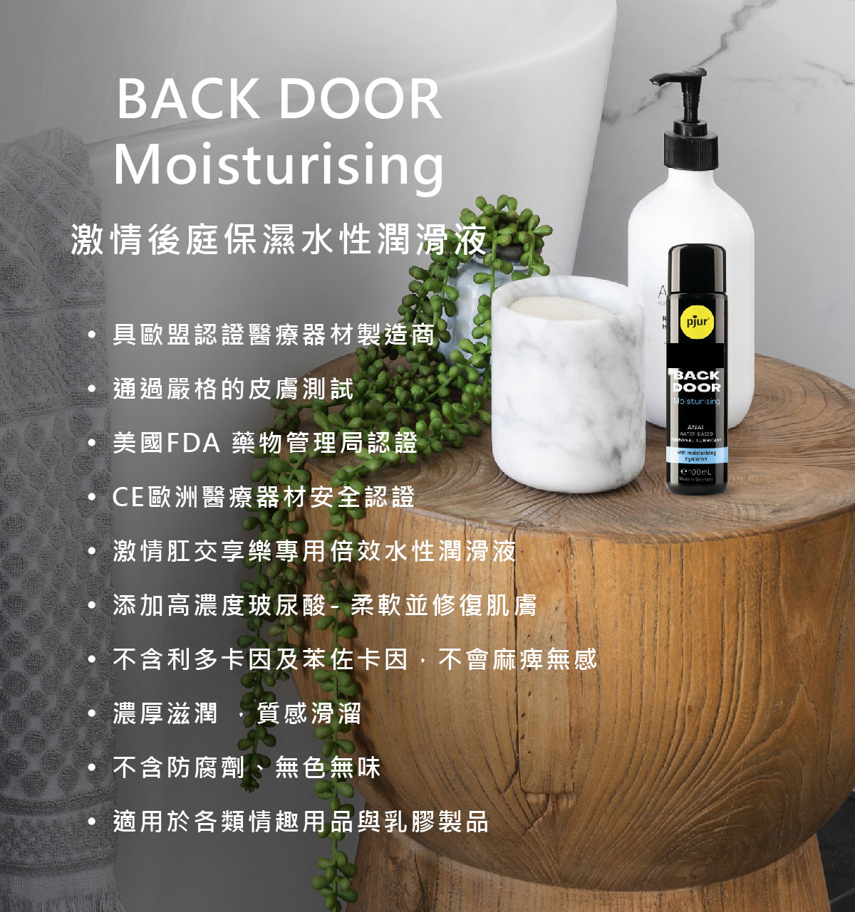BACK DOOR Moisturising 水性 - 專為激情肛交、強烈愉悅而生的強效水性潤滑液 ,特別添加更高濃度的玻尿酸,具有修復再生效果的玻尿酸,能有效鎖住大量水分,加倍提升潤滑效果,清爽不黏膩,滋潤且不殘留。不含利多卡因及苯佐卡因等麻藥成分,可降低後庭過度敏感,但不會麻木,不會積聚於體內,絕對安全。