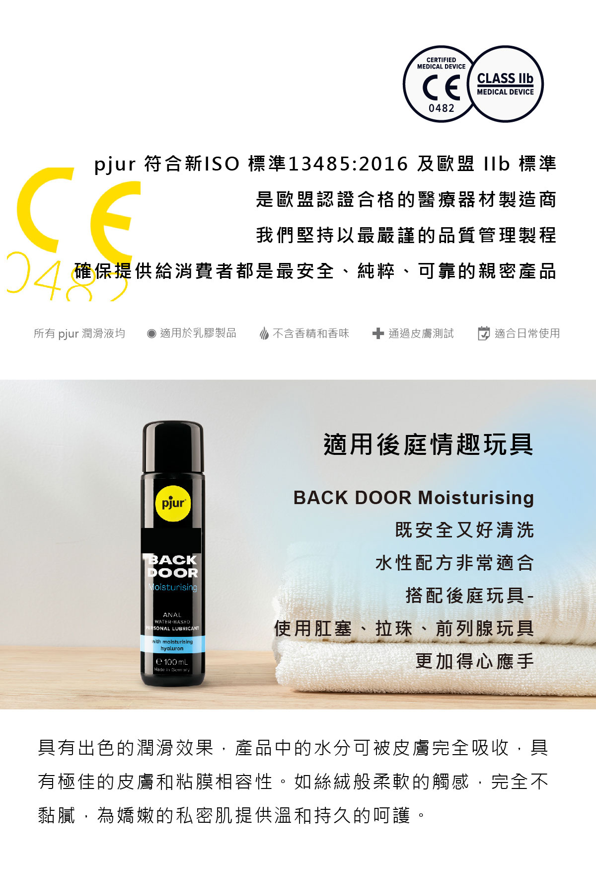 所有的pjur 產品均通過嚴格的皮膚醫學敏感測試,BACK DOOR Moisturising 水性潤滑液,不使用防腐劑、染色劑,不含石蠟,無色無味不含香精,100% 安全無刺激性,可安心每天使用。