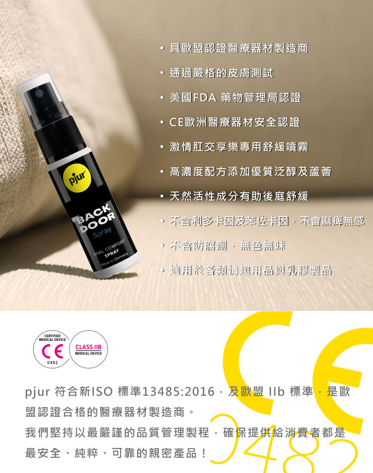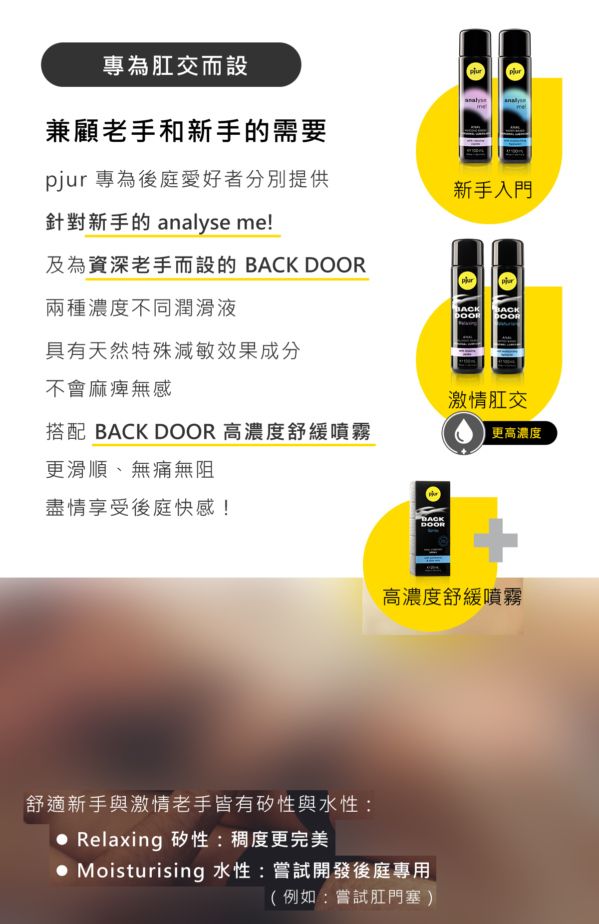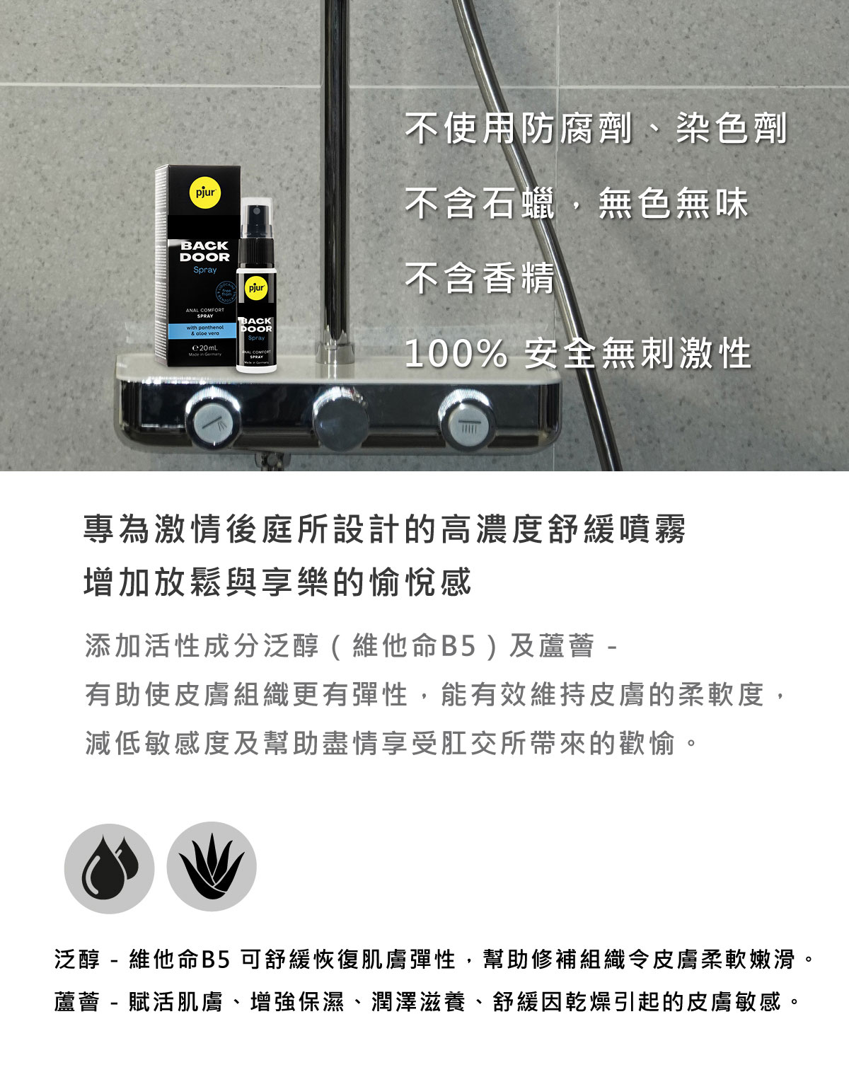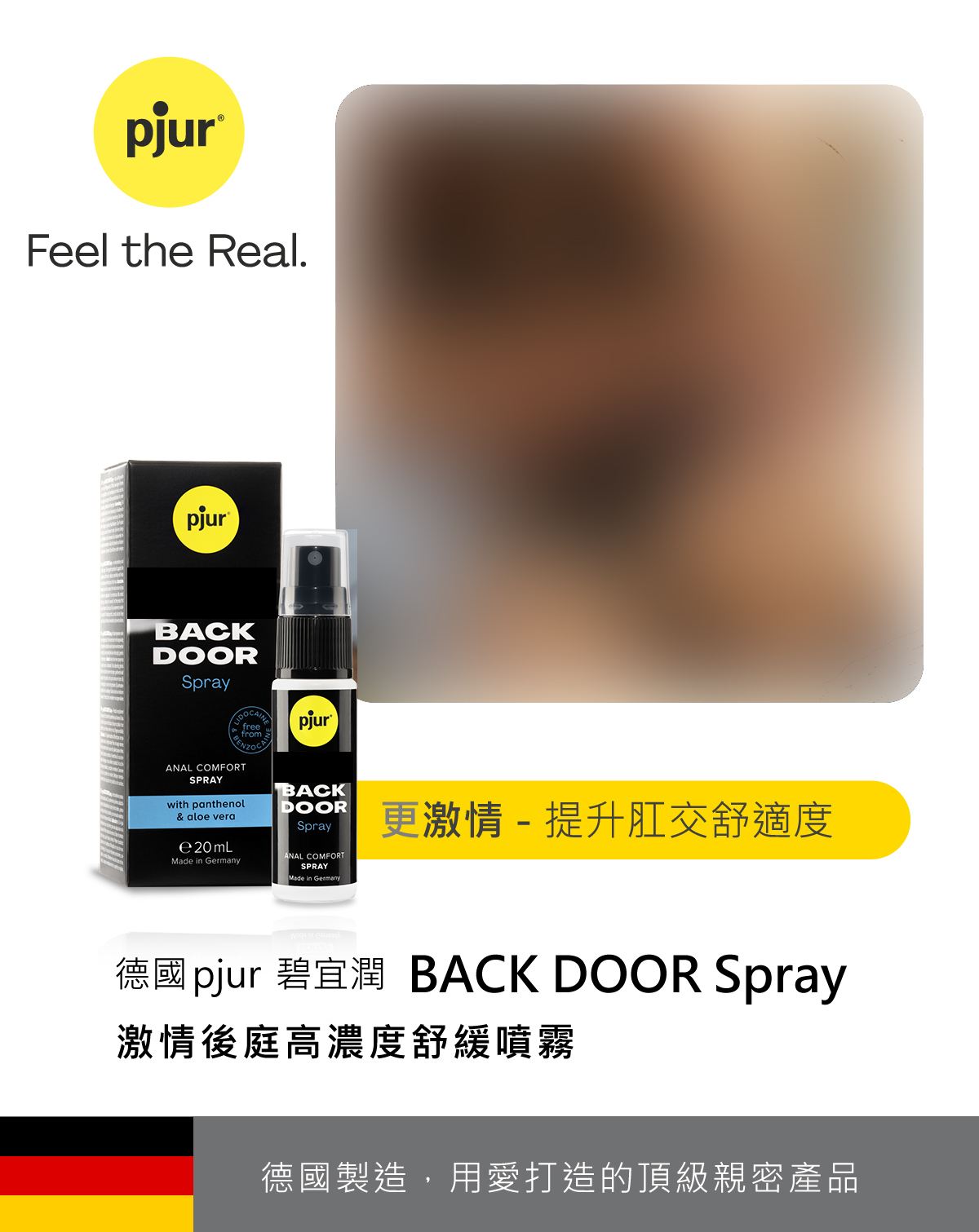 pjur 專為激情後庭所設計的高濃度舒緩噴霧- BACK DOOR Spray ,增加放鬆與享樂的愉悅感。添加活性成分泛醇(維他命B5)及蘆薈有助使皮膚組織更有彈性,會被皮膚表層吸收,能有效維持皮膚的柔軟度,減低敏感度及幫助盡情享受肛交所帶來的歡愉。
