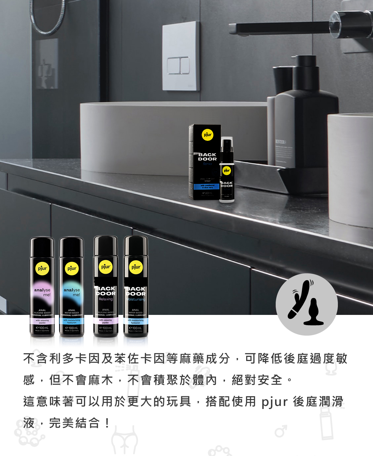 不含利多卡因及苯佐卡因等麻藥成分,可降低後庭過度敏感,但不會麻木,不會積聚於體內,絕對安全。這意味著可以用於更大的玩具,搭配使用 pjur BACK DOOR 激情後庭潤滑液,完美結合!