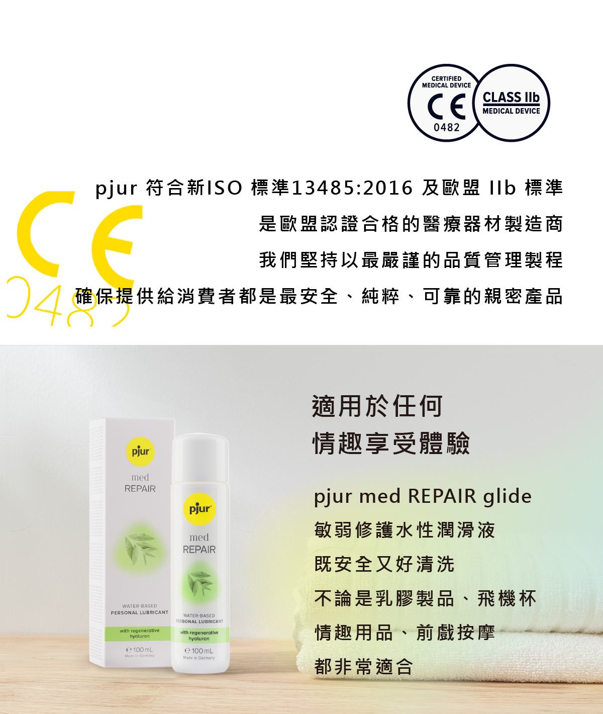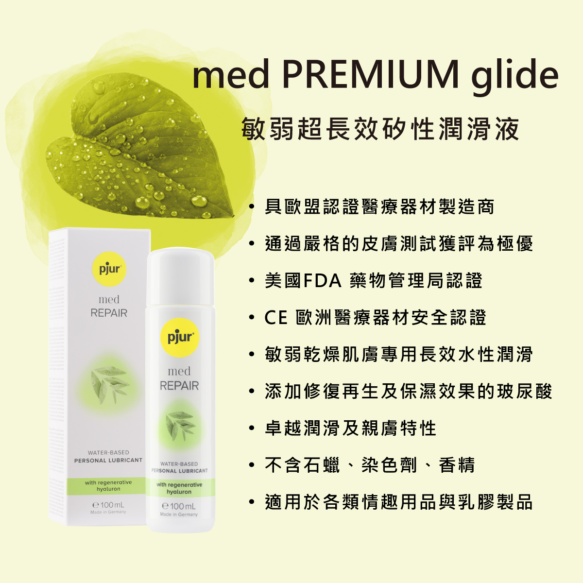 乾燥和高度敏感的粘膜需要特別護理,pjur med REPAIR glide 是專為乾燥敏感肌開發的水性潤滑液,對皮膚非常溫和,適合乾燥和受損敏感的私密肌。