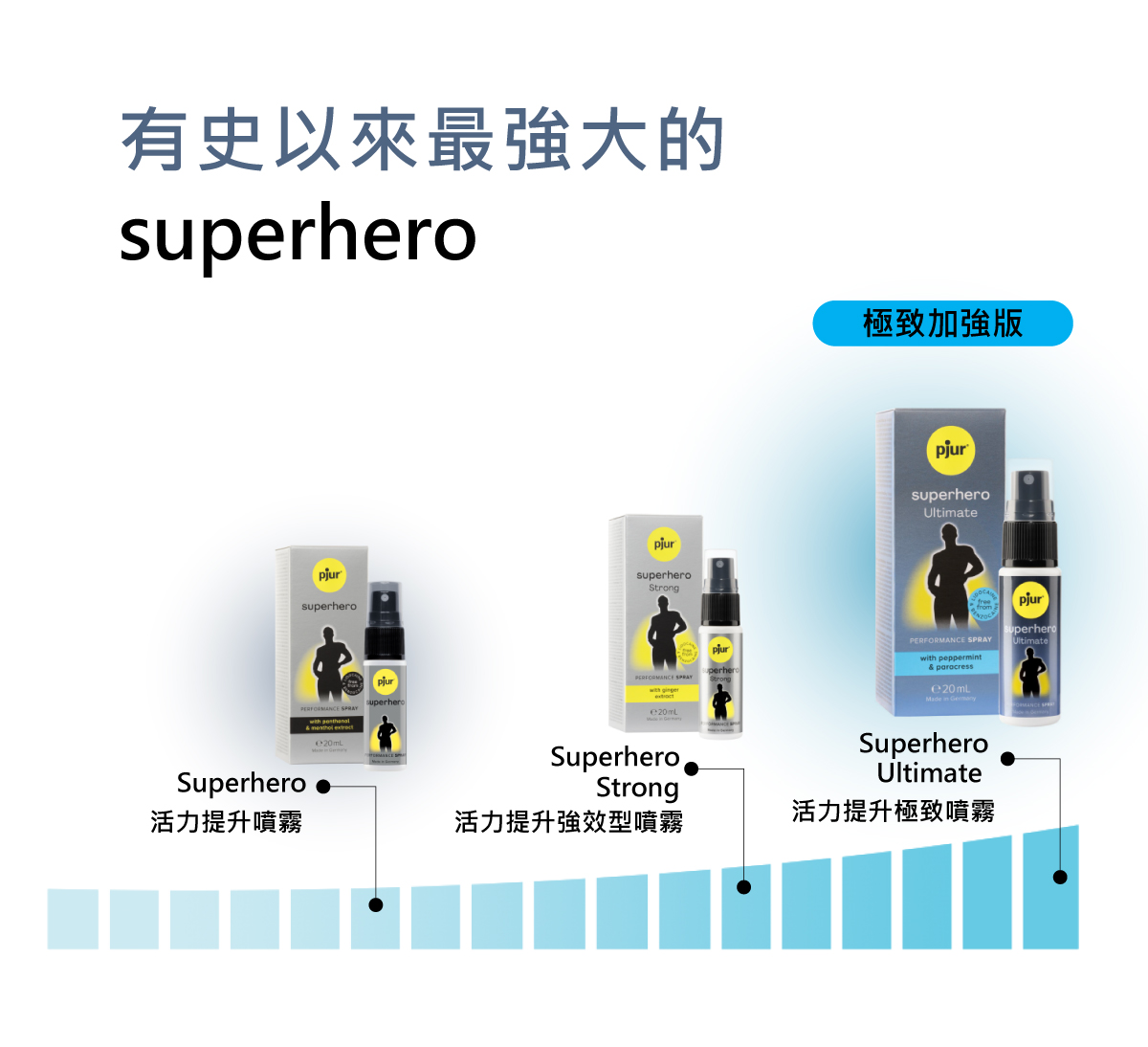 有史以來最強大的superhero,專為男士開發的 superhero Ultimate Spray 實現超能力的秘密武器。添加天然草本萃取,含有六種關鍵成分的活性複合物,有助於刺激提升活力、延長快感,是pjur 超級英雄活力提升系列最極致的男士噴霧。其天然活性成分,可降低皮膚過度敏感,不致麻痺無感,有助避免提早退場。