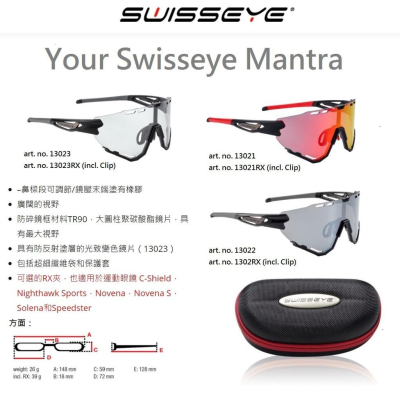 全新到貨 德國熱銷 SWISSEYE Mantra 廣角大鏡面 新品上市 好禮滿滿通通送給您 (SIS能量膠2包+BORONIA海洋浴鹽2包+VITTORIA自行車水壺1個) 三款鏡片可供挑選 Mantra鏡片:鍍衣膜炫紅色 13021 售價$1,500 Mantra鏡片:灰黑鏡片 13022 售價$1,290 Mantra鏡片:變色鏡片 13023 售價$3,000 ▶商品特色 ■ 重量:20g ■ 廣角鏡片;舒適視野 ■ 防霧抗刮鏡片材質 ■ 鼻墊可調整;輕鬆調整個人適合角度 ■ 鏡架掛耳止滑功能設計